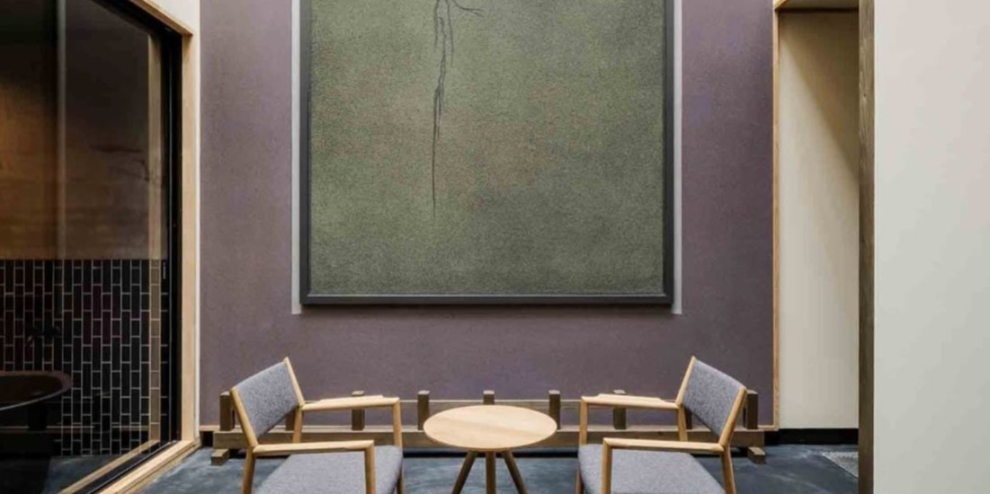 町家の中心にあるのは、高い天井まである大きな左官アートが天窓からの光を受ける光庭。