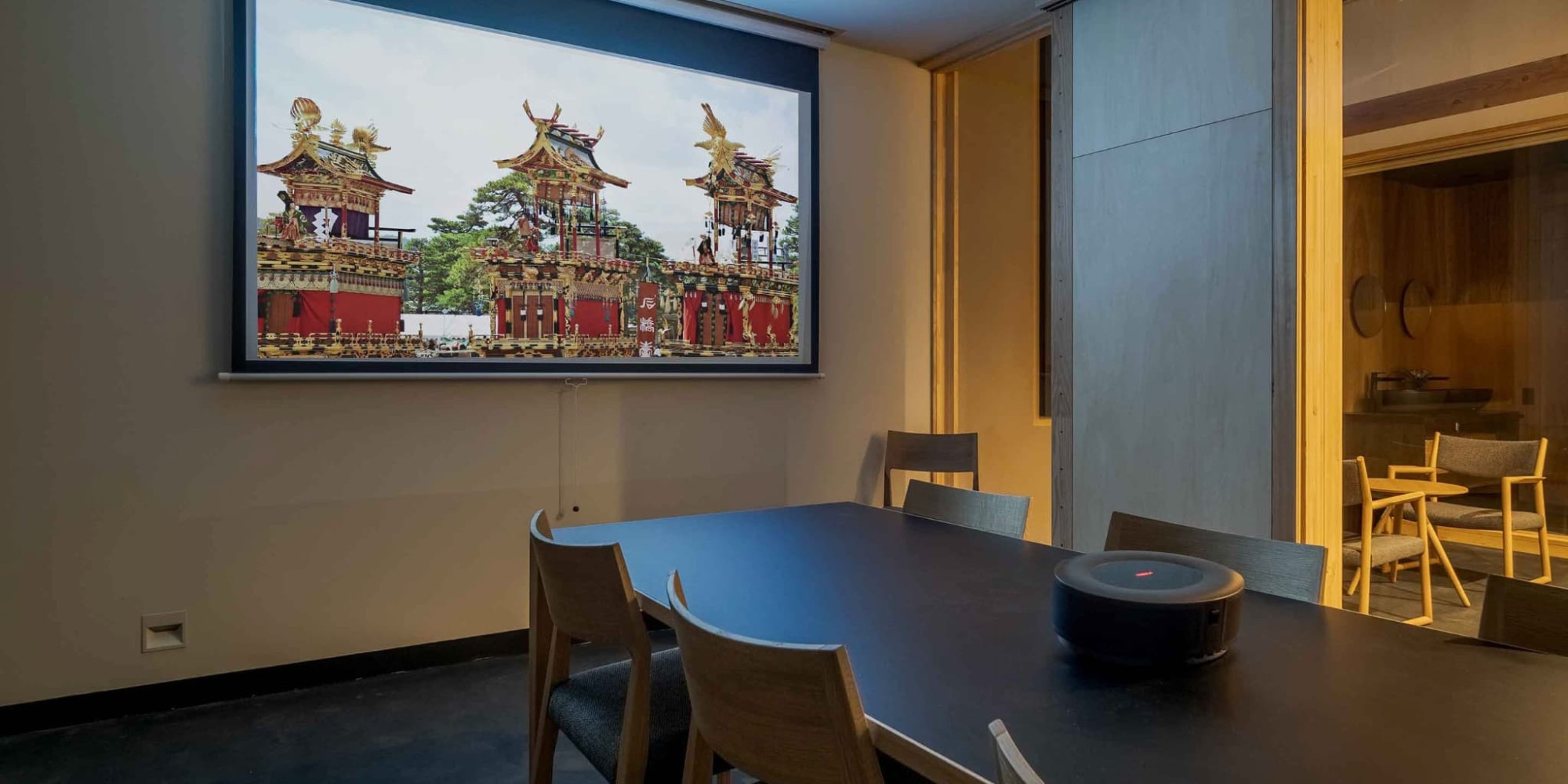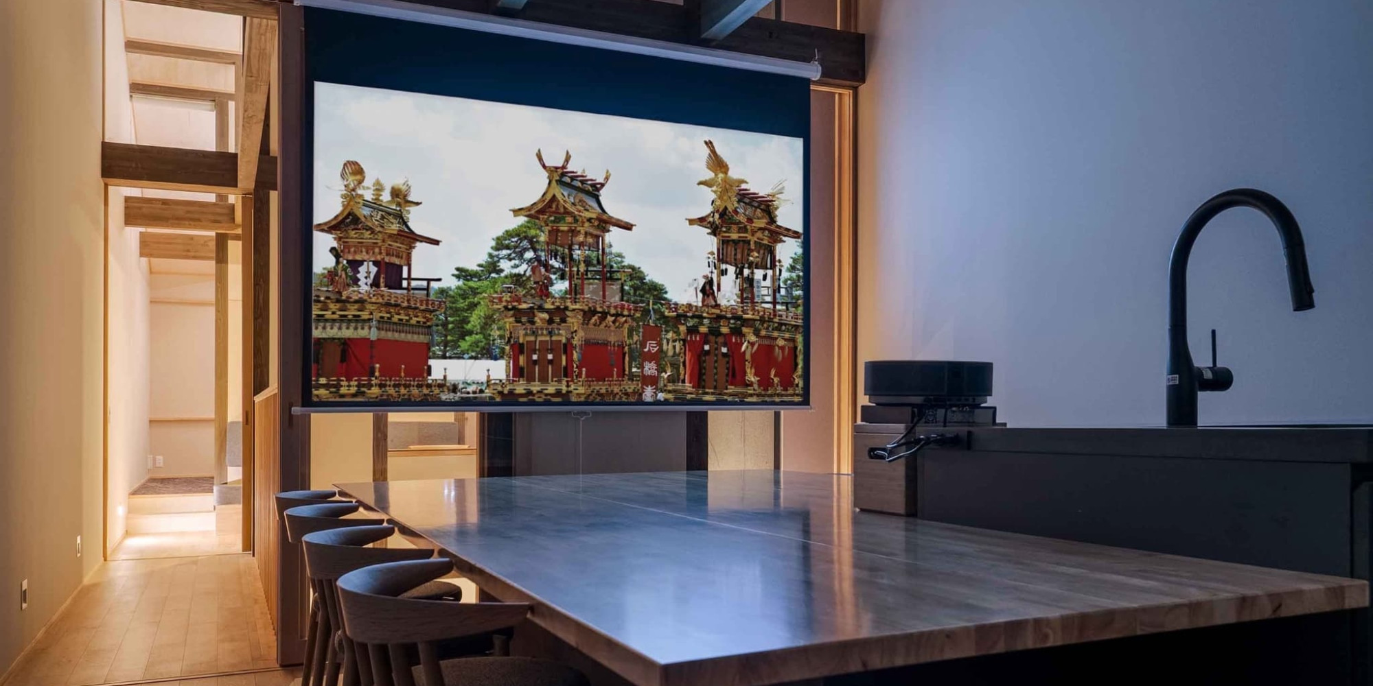 町家特有の土間を思わせる空間に、大迫力の映像と音響が楽しめるプロジェクターを完備。