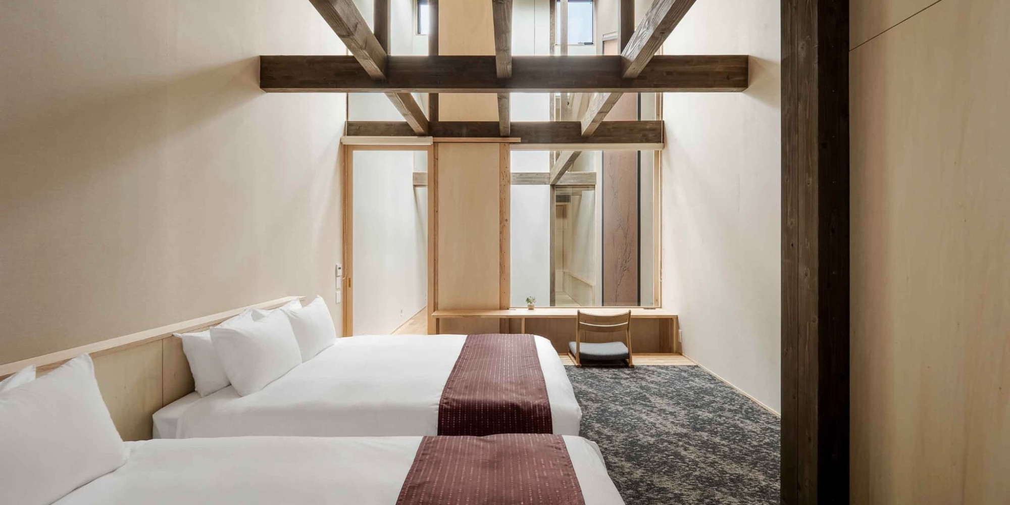 高い天井に梁が交差する開放的な空間にクイーンベッド2台を配した、ゆったりと寛げる洋寝室。