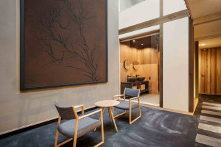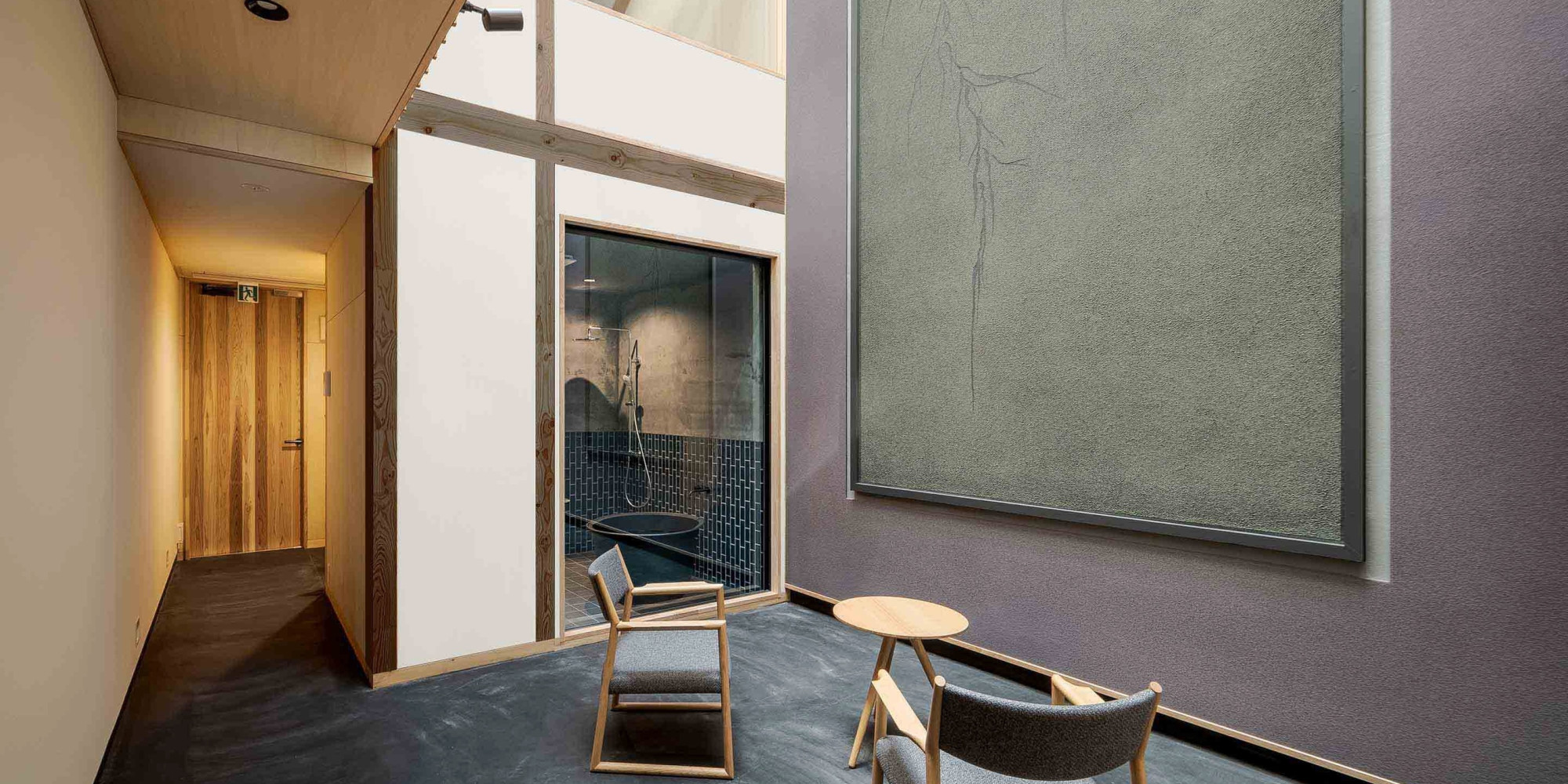地元・飛騨高山の左官職人・挾土秀平氏による高さ9mもの大作が彩る空間。
