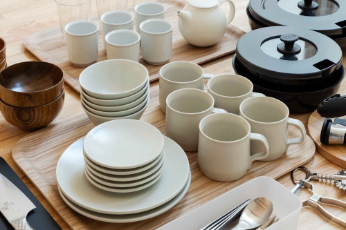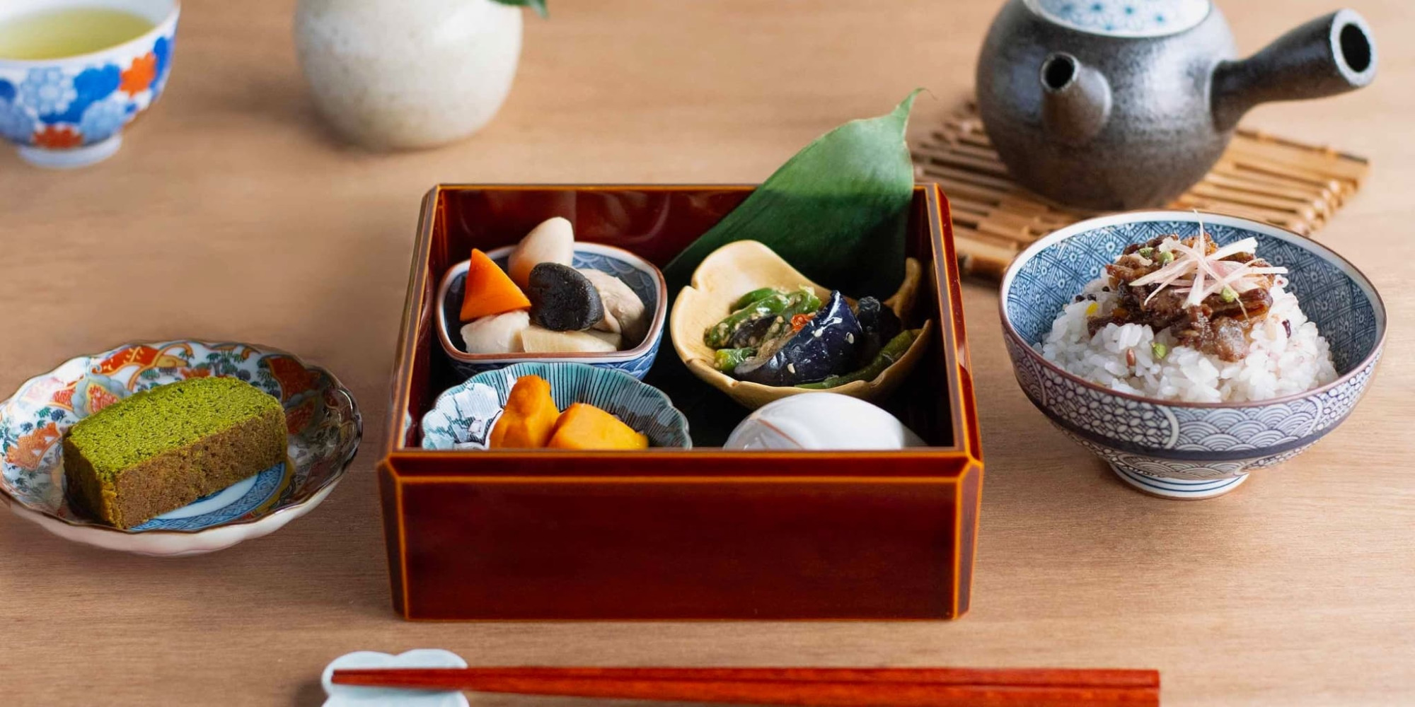 朝食を彩る器には、伝統工芸品「飛騨春慶塗」の弁当箱、
