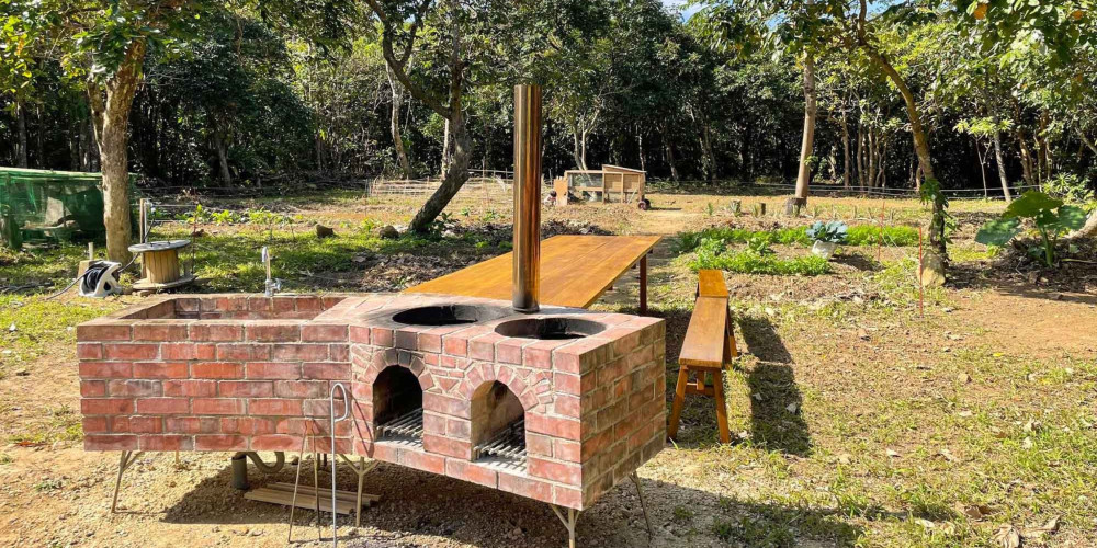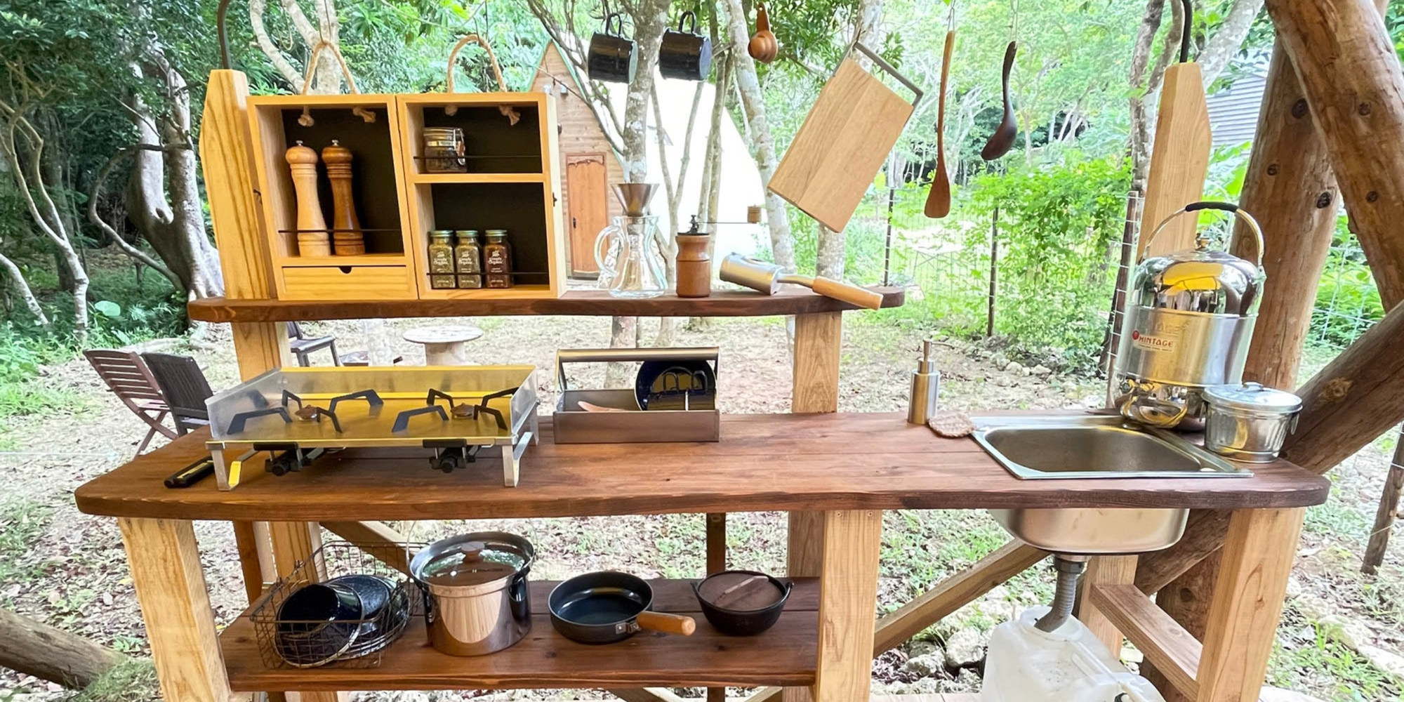 広い屋根付きのリビングスペースにはキッチン、調理器具や食器、調味料も完備。