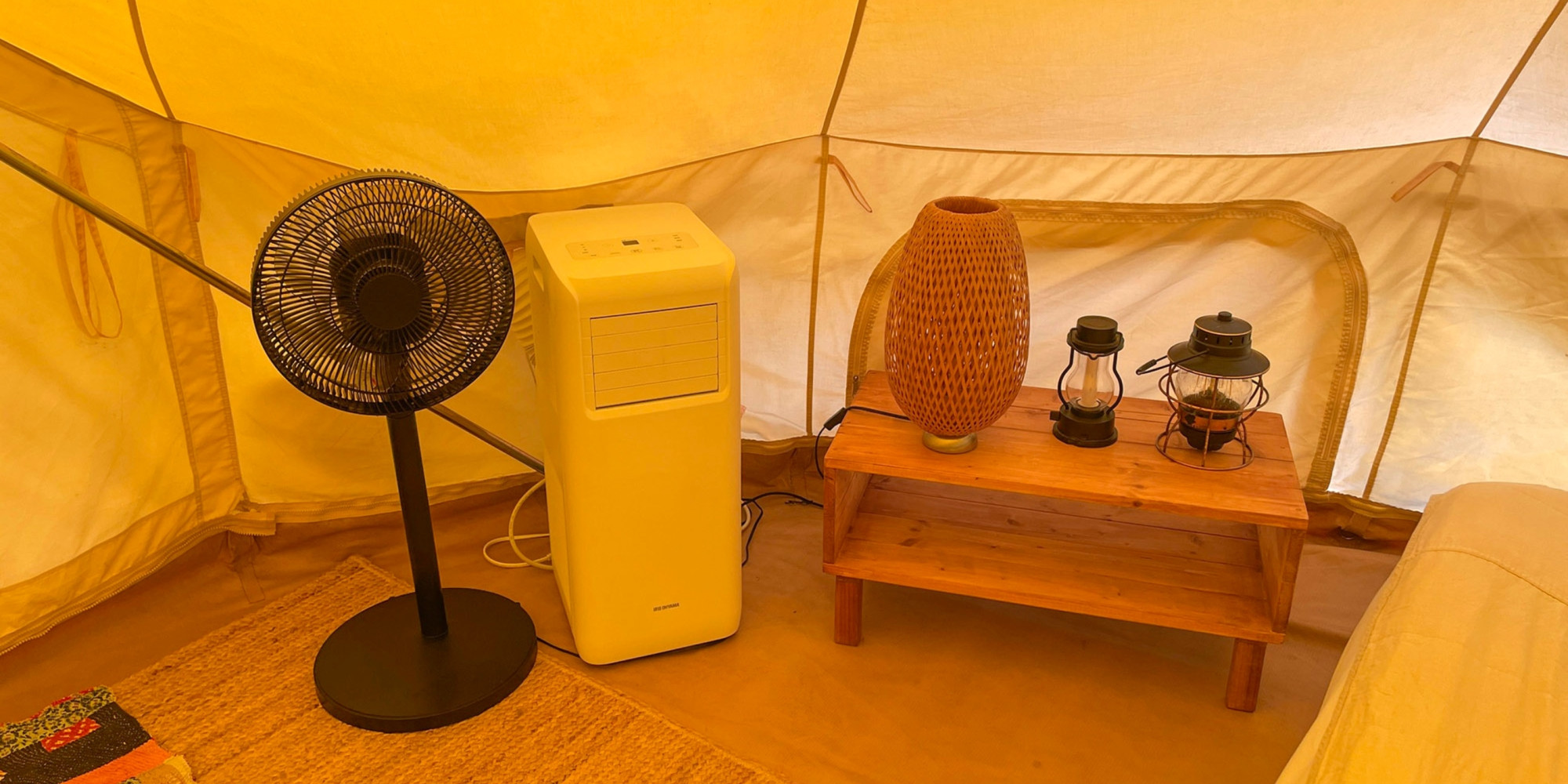 エアコンや扇風機完備。テント内でも快適にお過ごしいただけます。