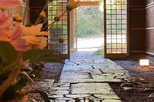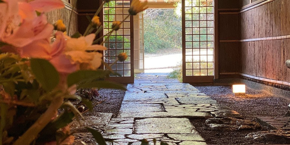 打ち水が清々しい石畳のアプローチでは、季節の花と伽羅・白檀の香りでお客様をお出迎えします。