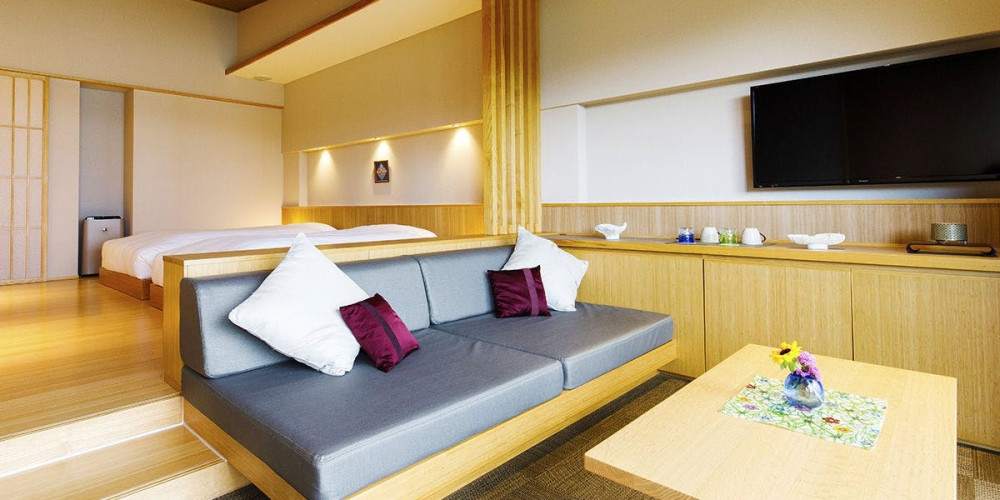 琉球畳リビング+テラス・ベッド幅120cm・冷蔵庫ドリンク無料・ミキモトアメニティ付(ヘア・ボディ・スキンケア)