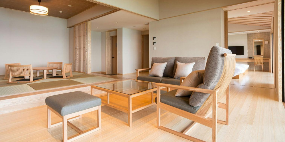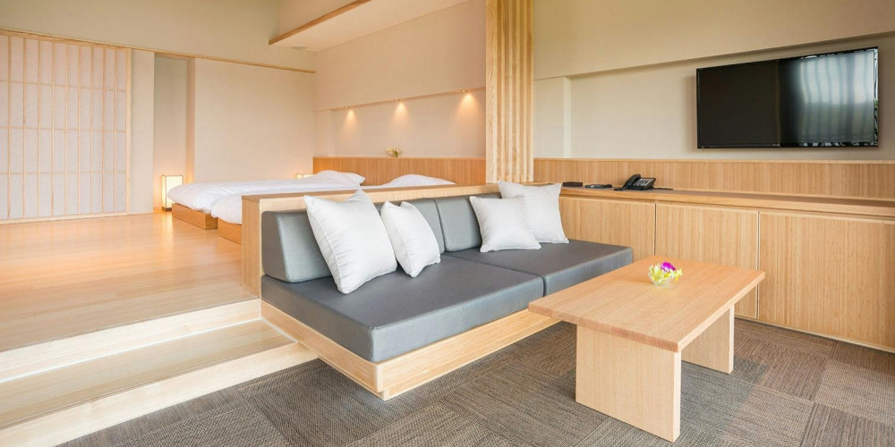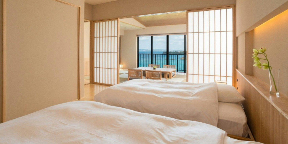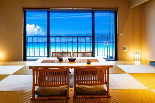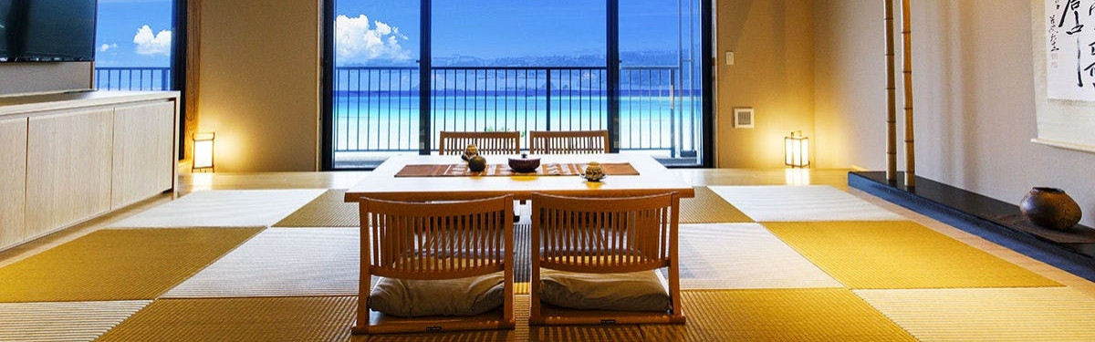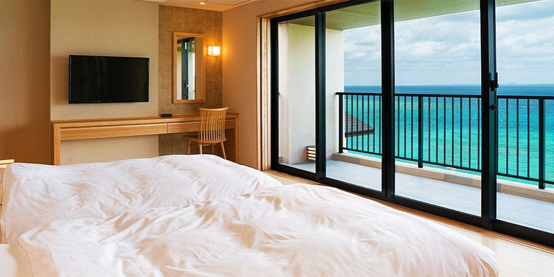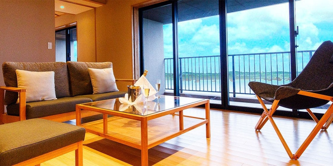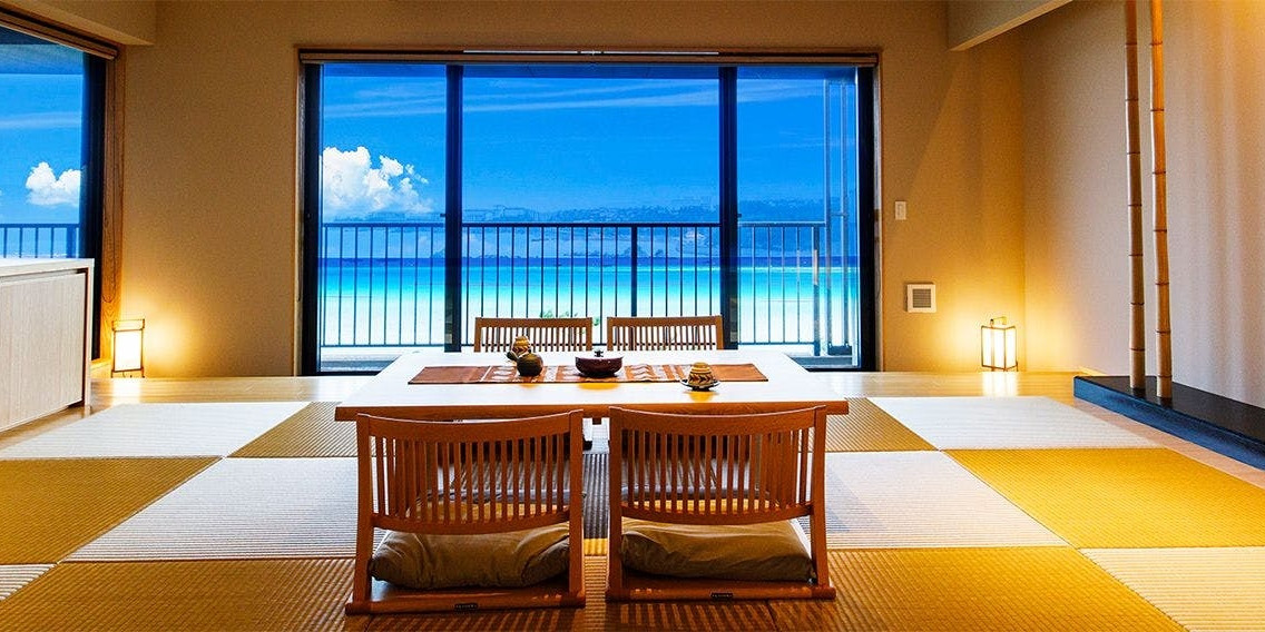 最も景観が美しいプレミアムな空間。海を臨むベッドルーム+リビング(琉球畳小上がり)+テラス。