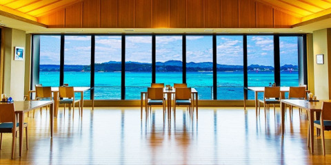窓の先には本部半島等、沖縄特有の風光明媚な情景の世界___。