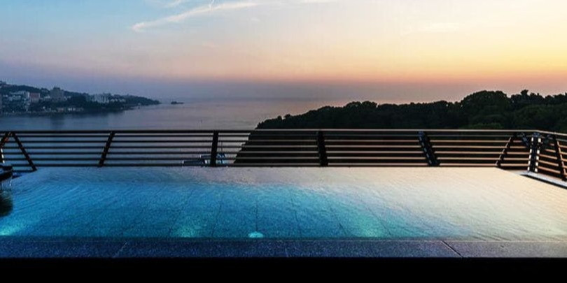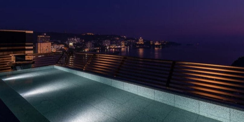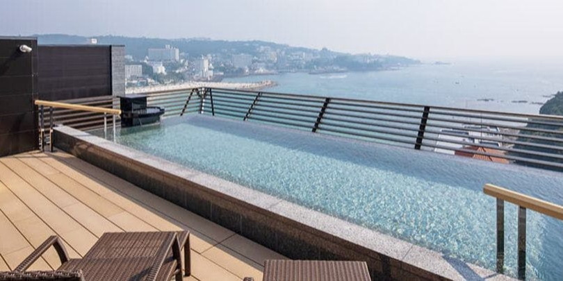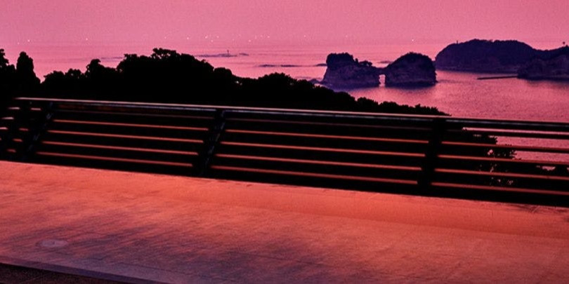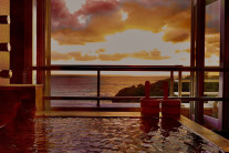 日本の夕陽の宿・百選に選ばれる旅館むさし。その夕日を特別な空間で眺めるできる露天風呂では、