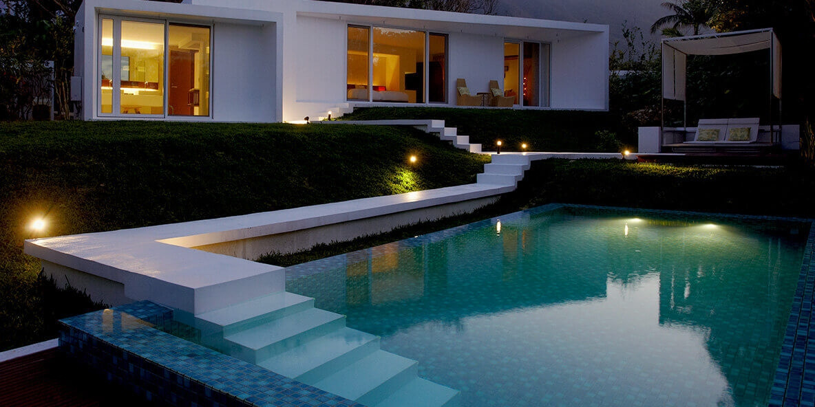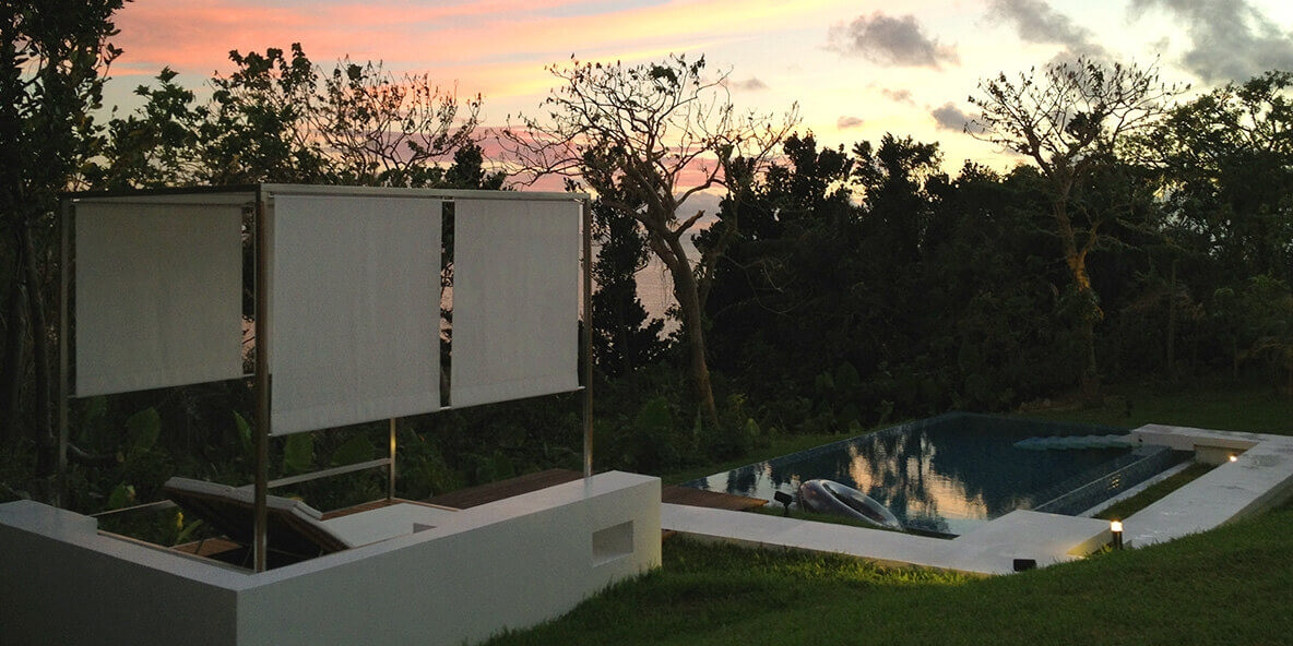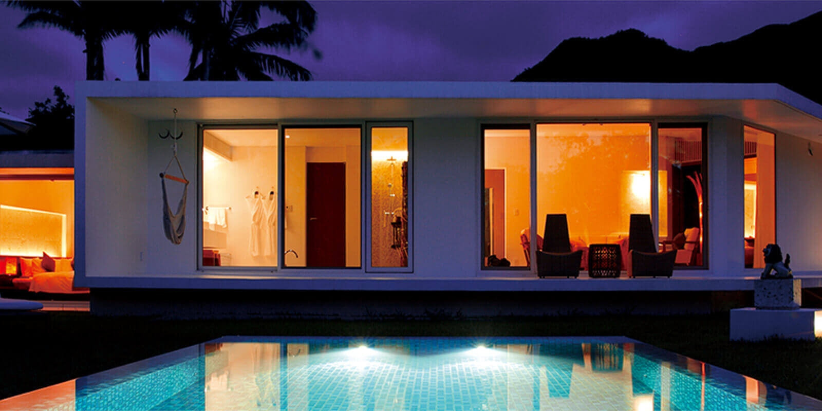 亜熱帯の八重山に夕日が落ち、夜が訪れるとプールがライトアップされ、