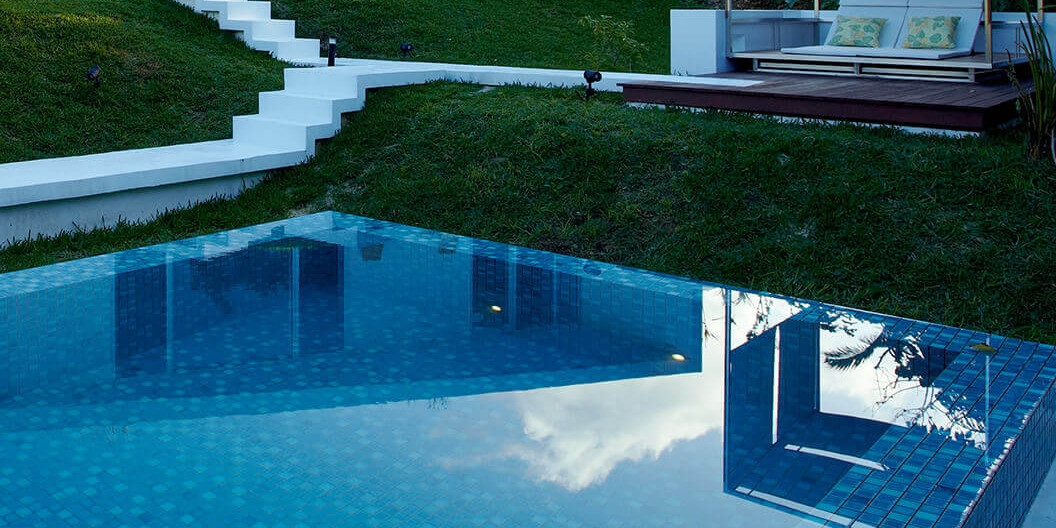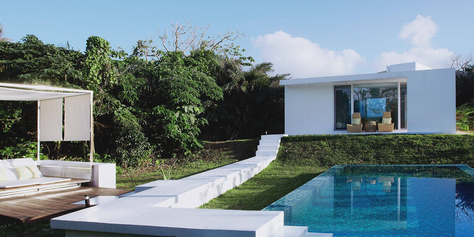 ヴィラから続く真っ白な道の先には珊瑚の海をイメージした青を基調とするプールが広がり、