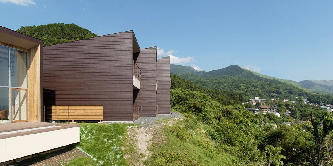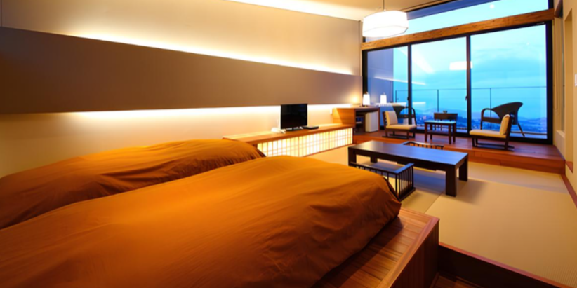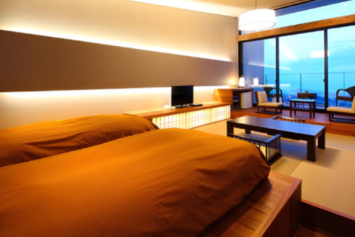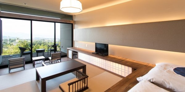 全室半露天風呂付。別府を一望する和モダン建築の絶景宿