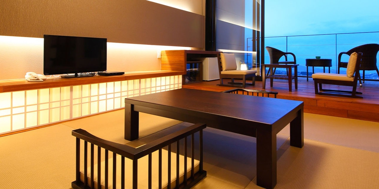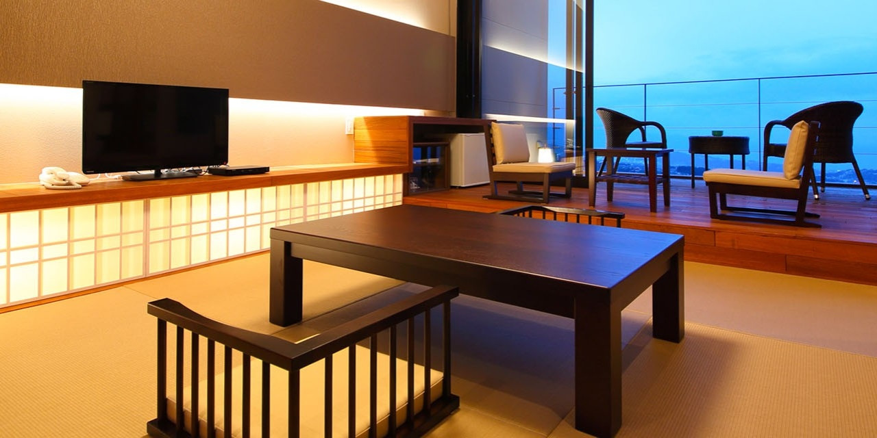 ラウンジには大きなテラスがあり別府を一望する絶景がご覧いただけます。