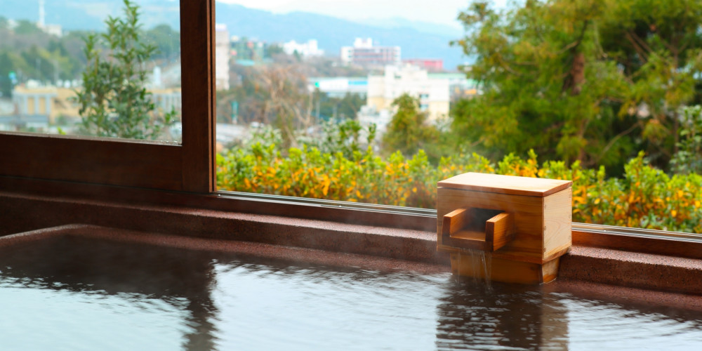 別府を一望する高台に位置し、弱酸性低張性高温泉・硫黄泉が湧く堀田温泉の湯を、