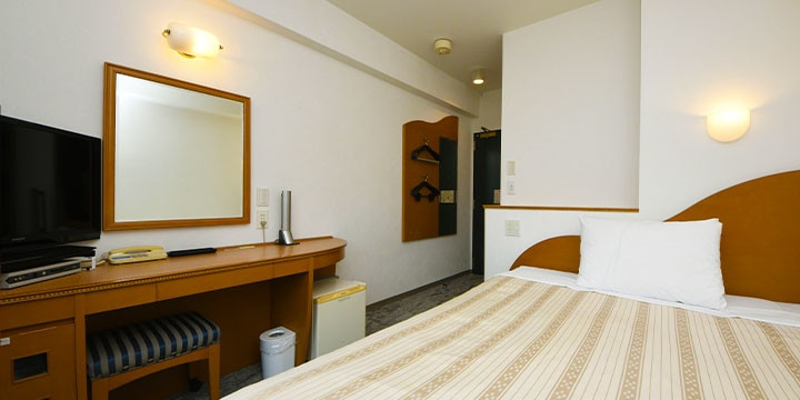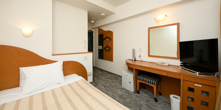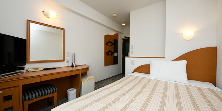 コンパクトなお部屋の作りですが、お二人でもゆったりとくつろげるダブルベッドをご用意。