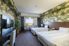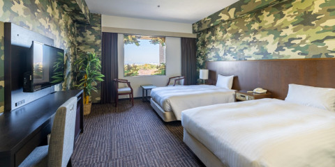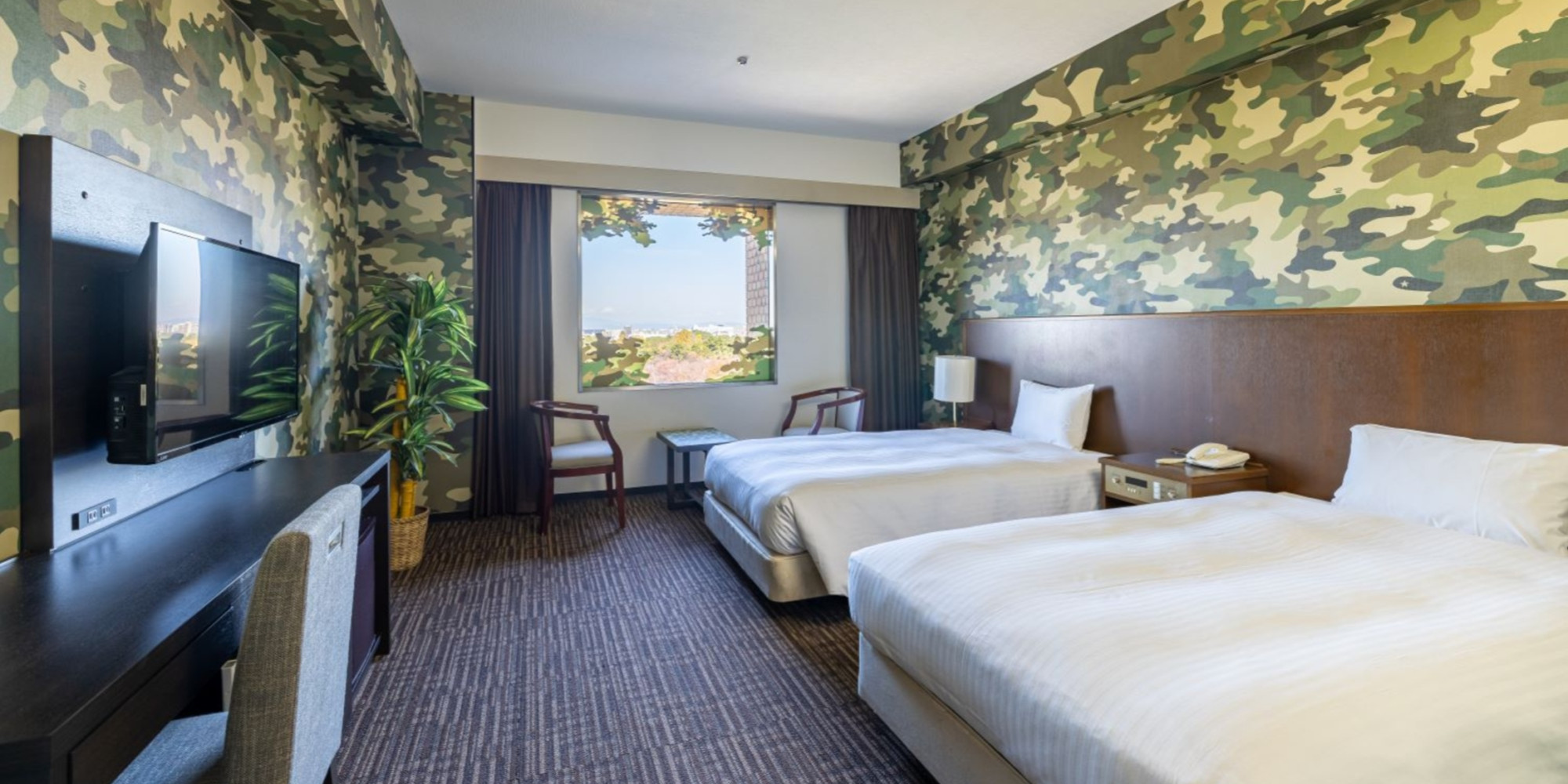 旅行気分を盛り上げる、迷彩柄の隠れ家のような客室。