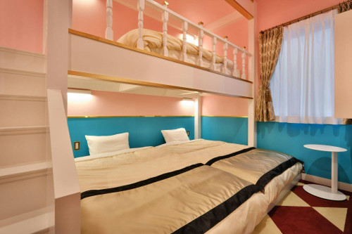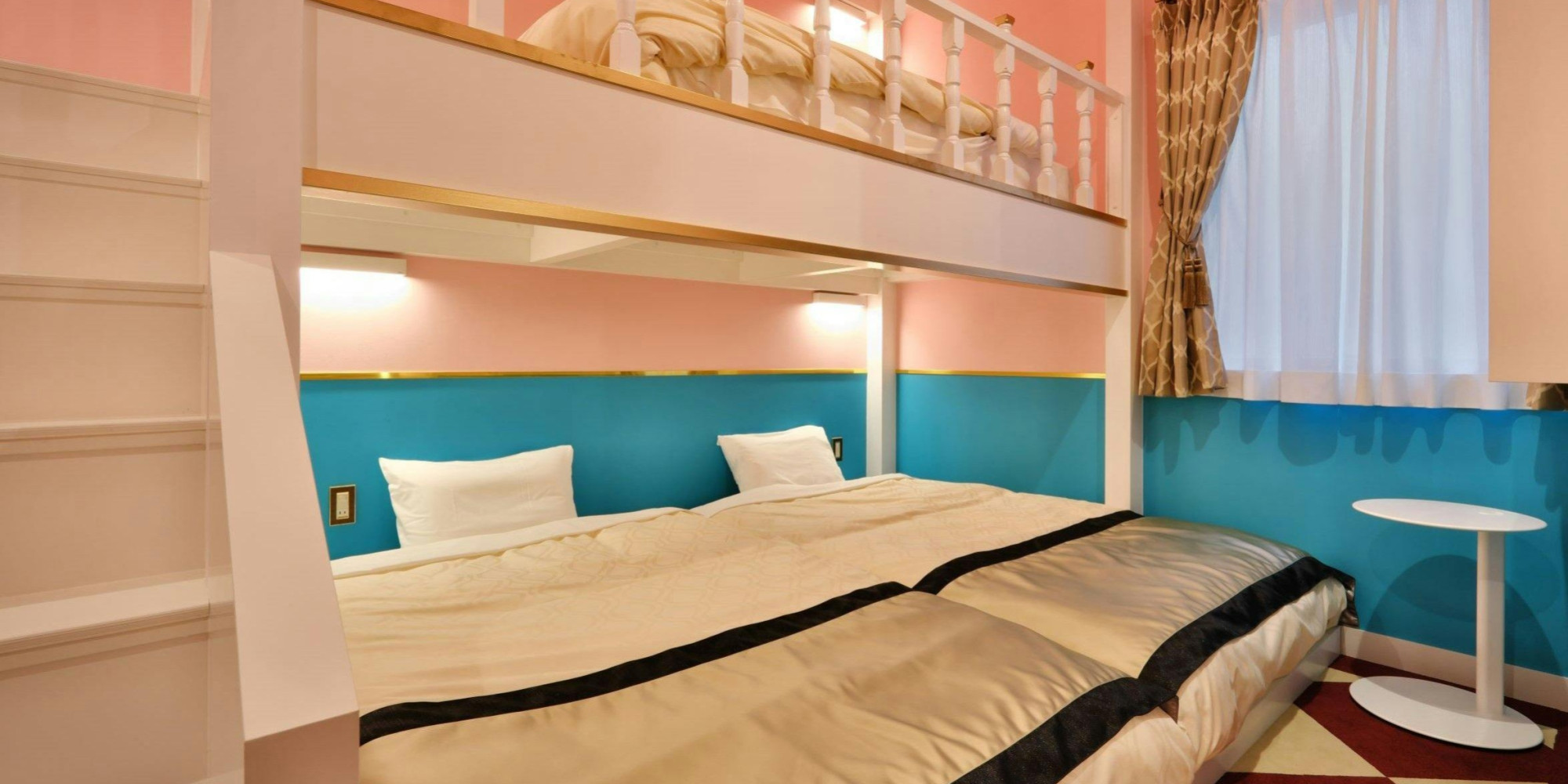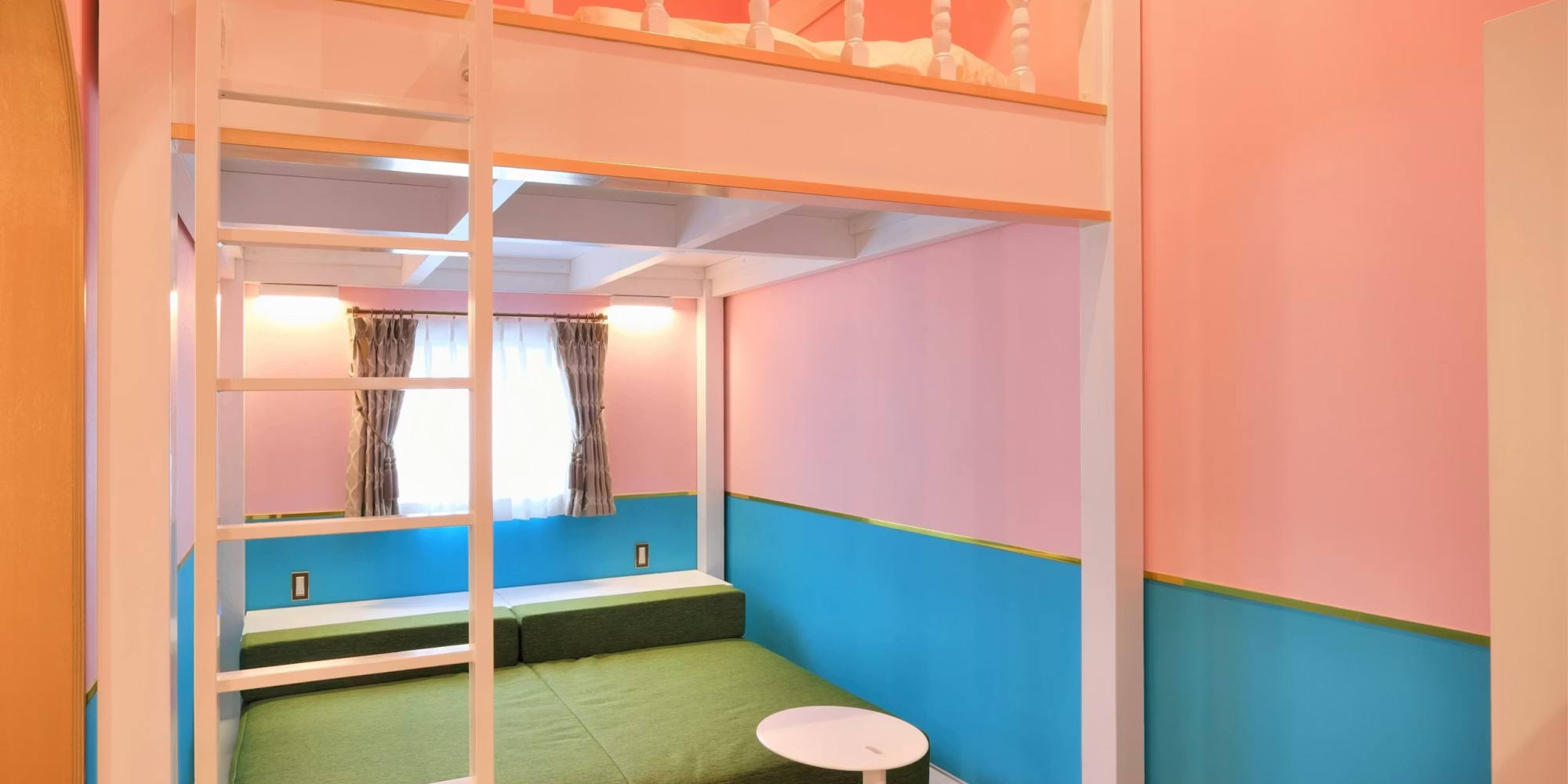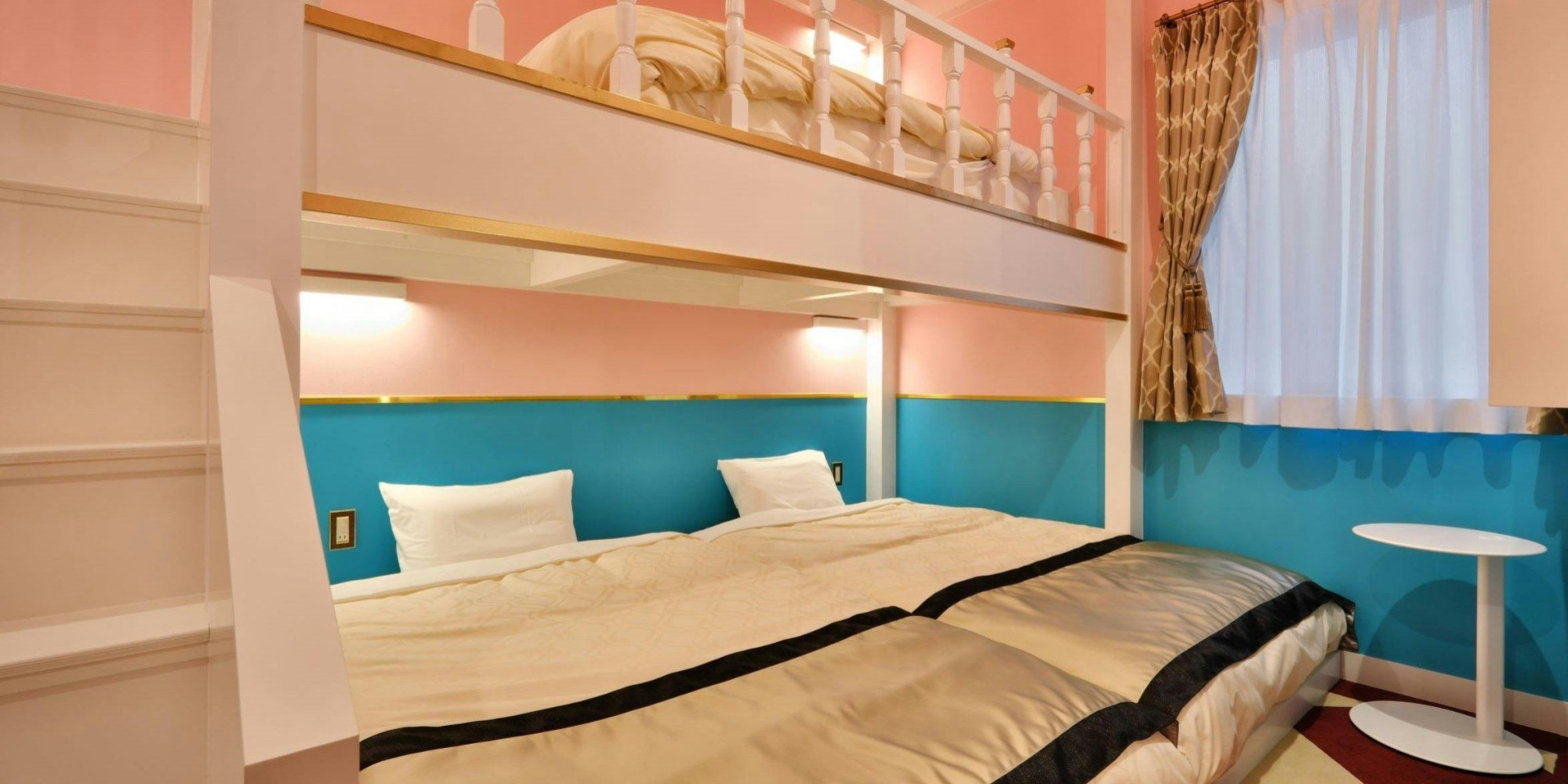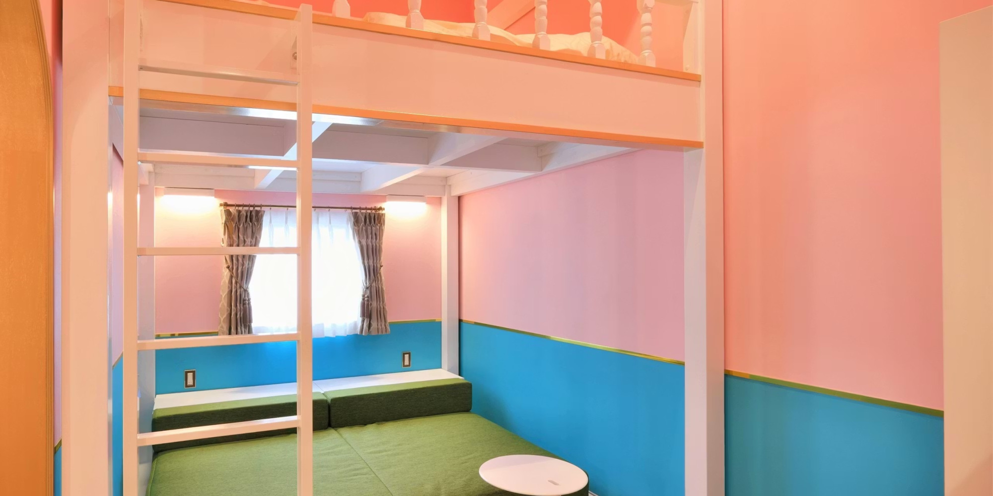 客室の特徴 梯子を昇ると上段はロフト、下段は女子会に最適なソファーあり。トリプルルームとともに「3人旅」にぴったりのお部屋。