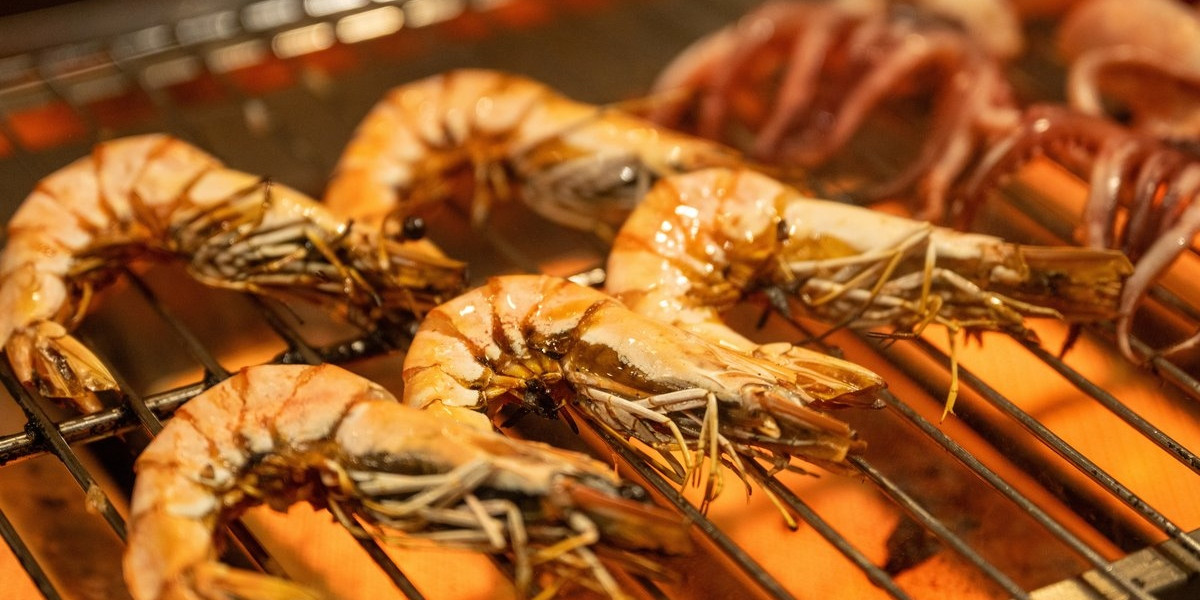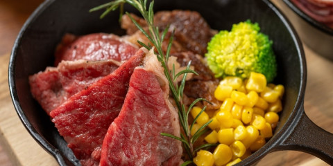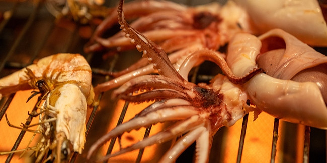 夕食では、ステーキや海鮮、野菜などを。朝食では、ベーコンやウインナーなどを焼き上げてくれるパフォーマンスキッチン。