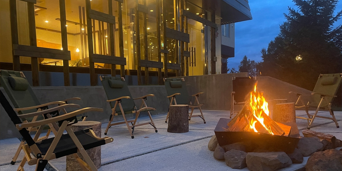 丸太や薪、ランタンなどがアウトドアの雰囲気を演出。