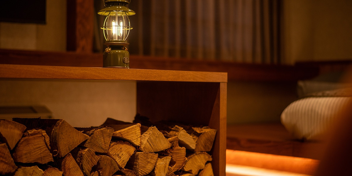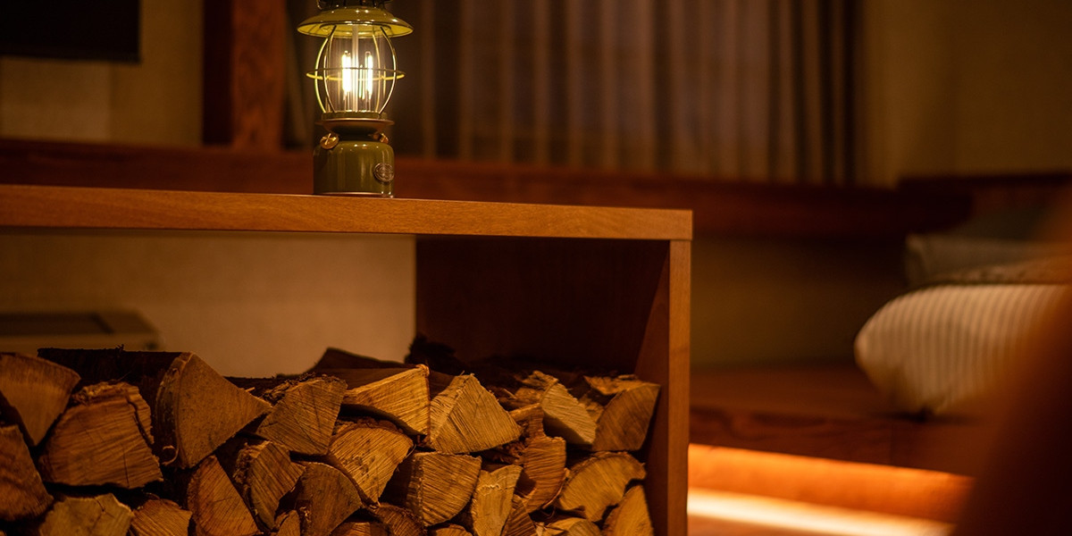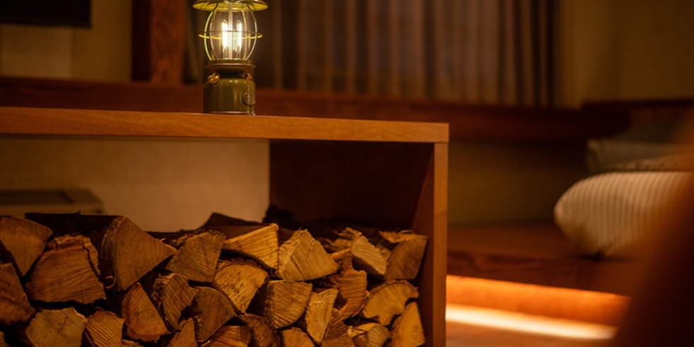 薪やランタンなど、アウトドアテイストも、随所に散りばめられています。