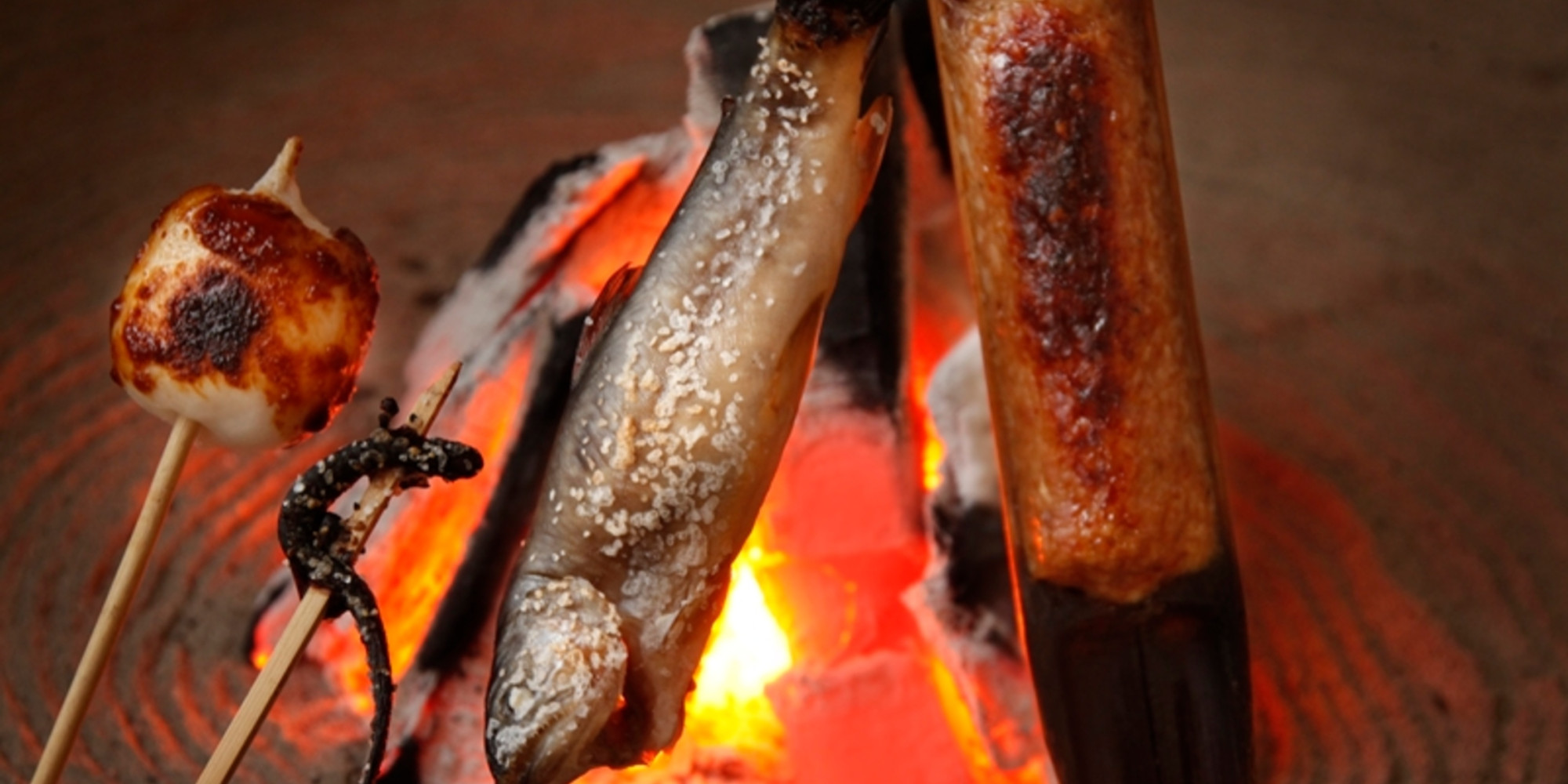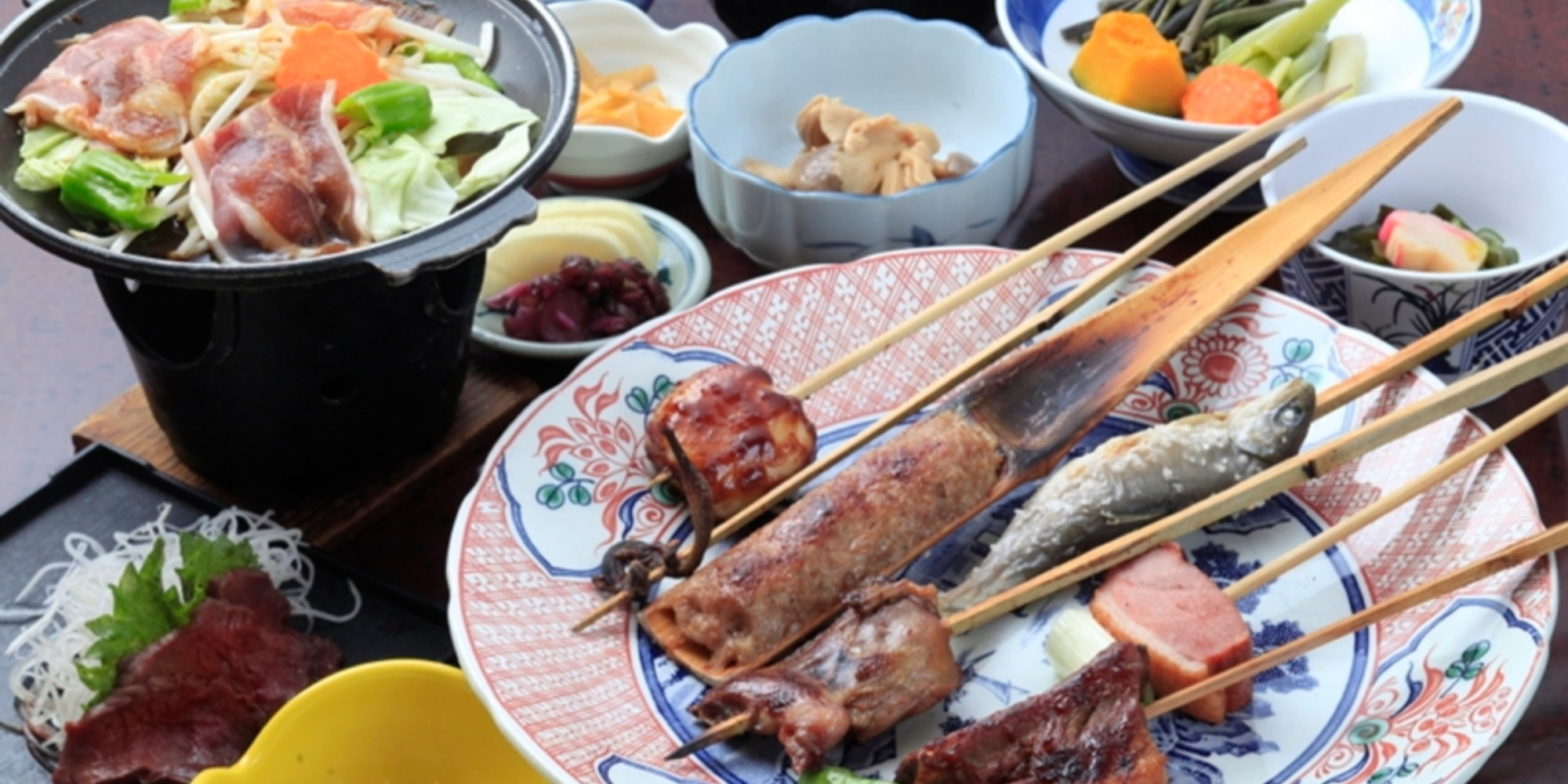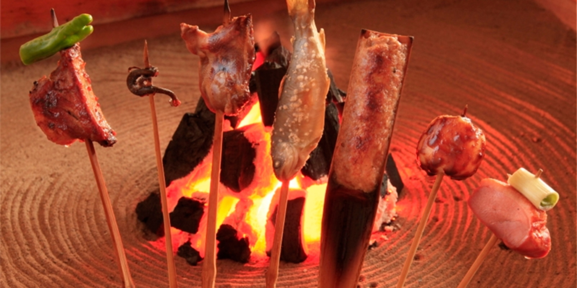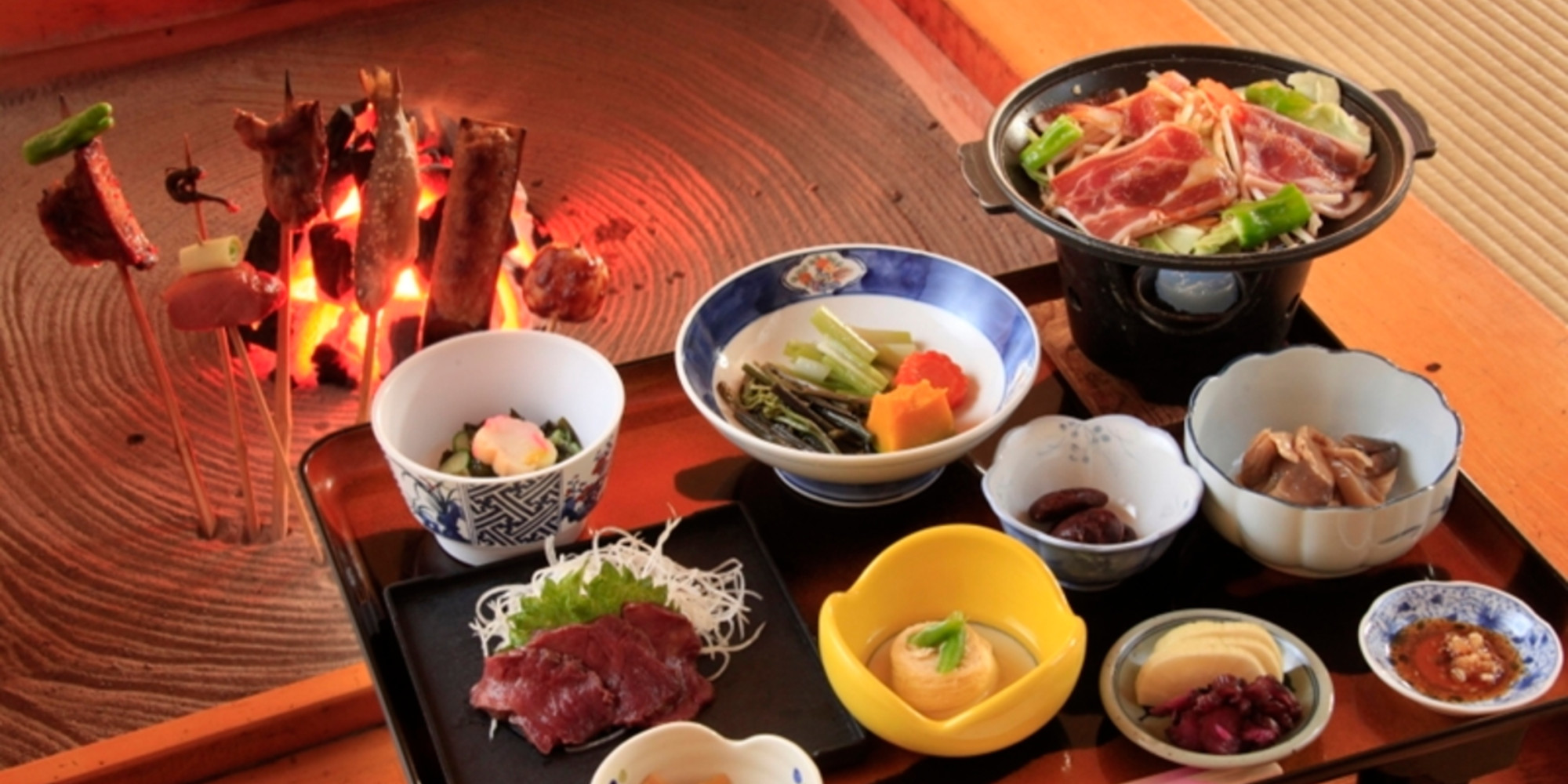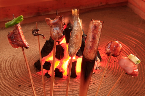 いろり料理は地元でとれた魚の串焼きの他にばんだい餅、サンショウウオなど珍しいものもございます。
