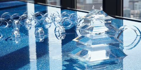 大阪城、八百八橋のオブジェをあしらい、水都大阪をイメージした水盤。大阪のランドマークを描いたオリジナル版画など遊び心溢れるアートワークを楽しんで。