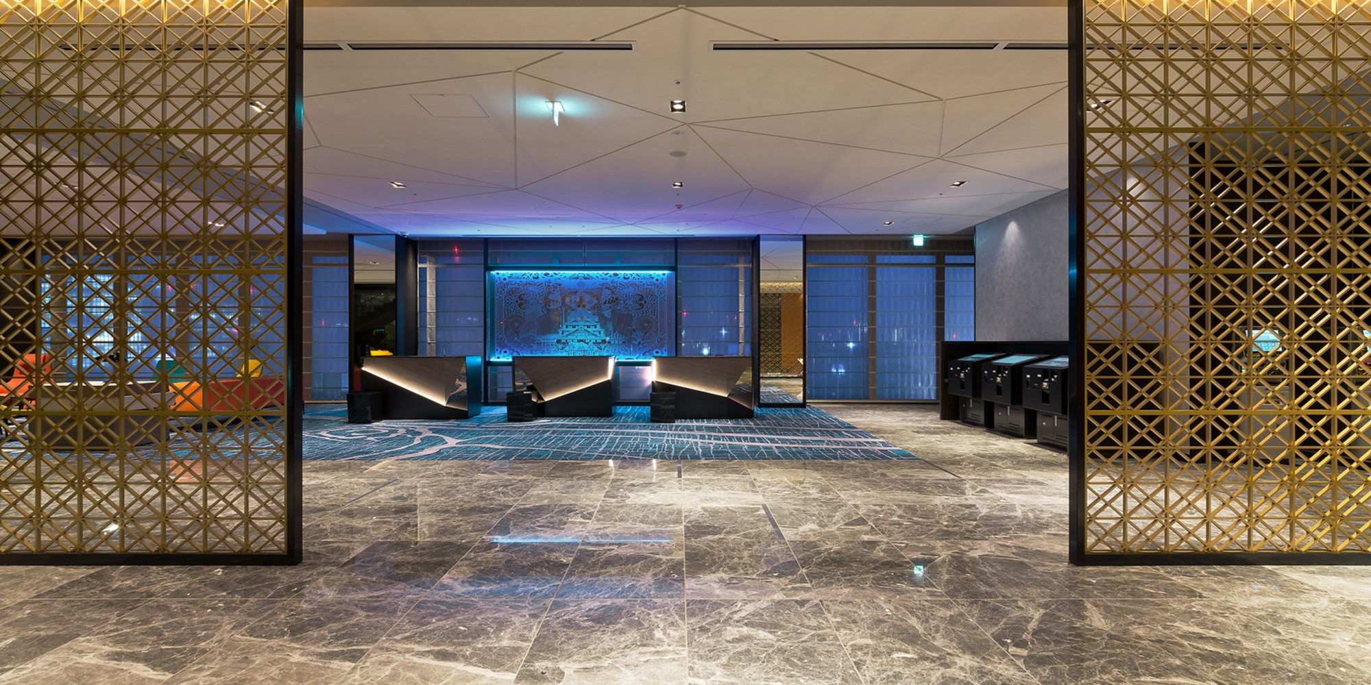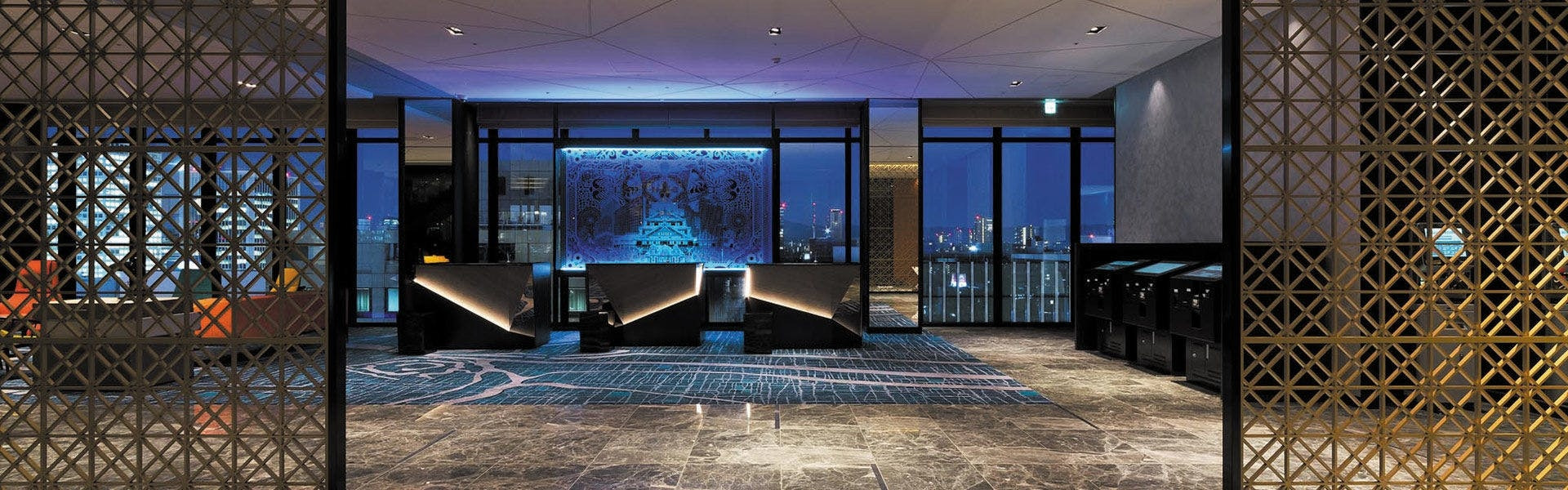 万華鏡のような幾何学模様のカーペット、光きらめく万華鏡照明。そして、大阪の歴史を感じるウォールアート。