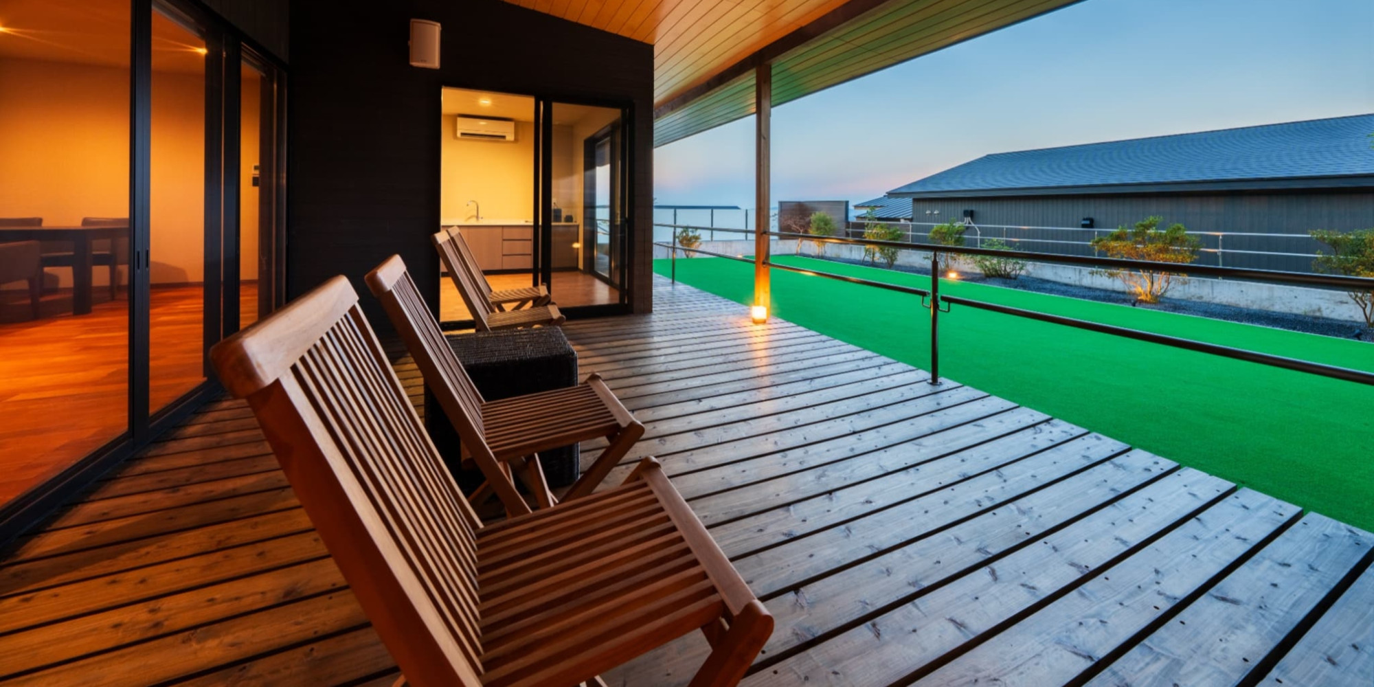 完全独立型のヴィラ。100㎡の広々とした空間で誰にも邪魔されない贅沢なひと時を。和洋室タイプで5名様までご宿泊が可能。ご家族やご友人同士はもちろん、おふたりでゆったりと過ごす滞在にもおすすめです。