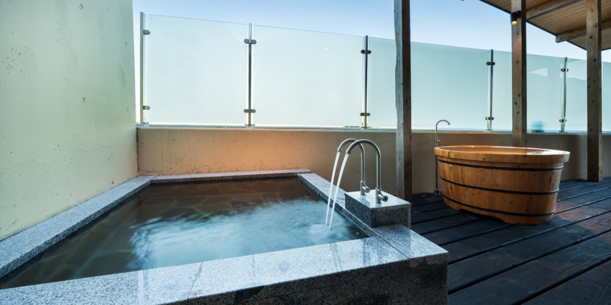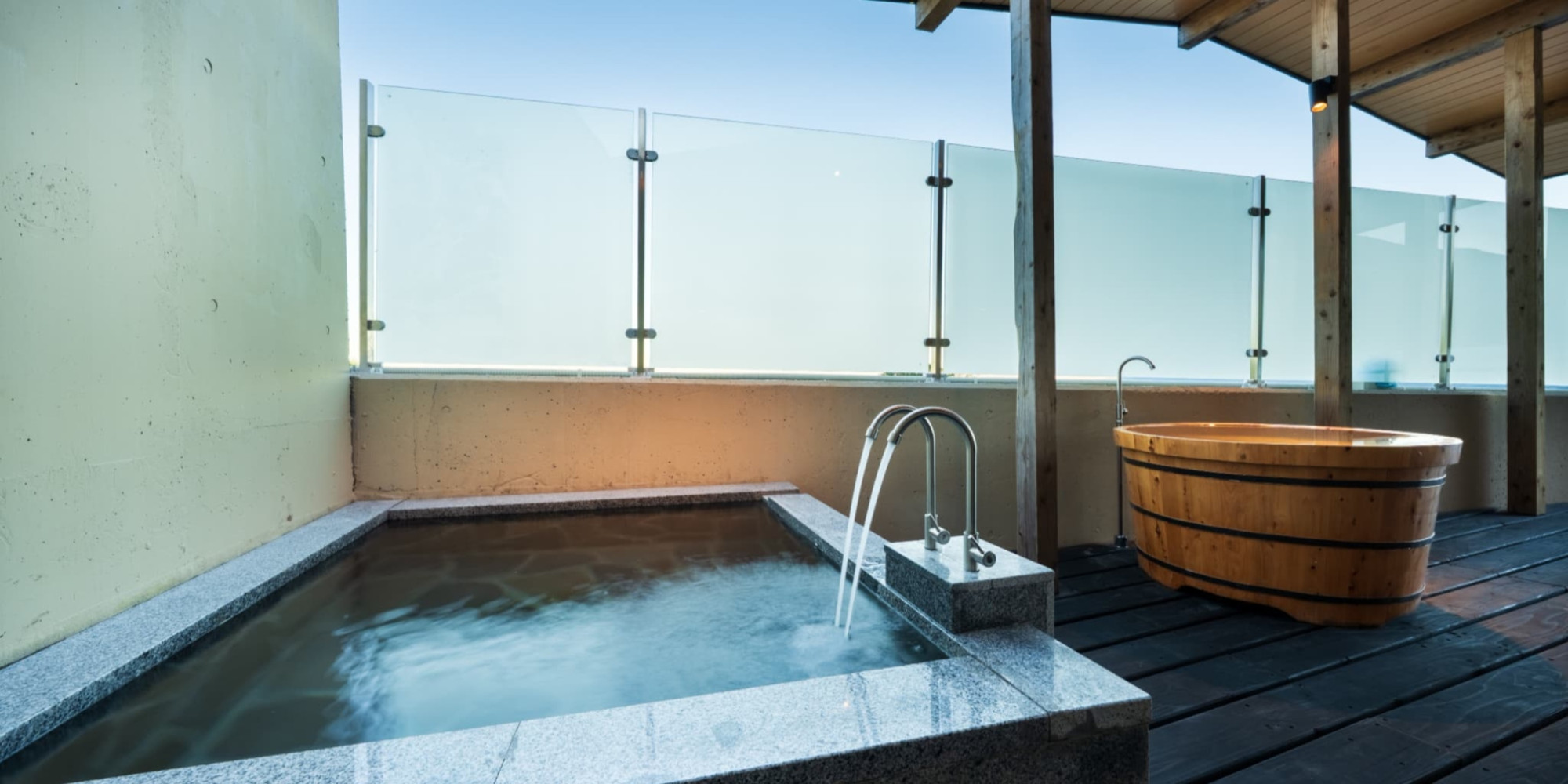 すべてのお部屋に、露天風呂と内風呂を完備。 プライベートな空間で、好きな時間にゆったりと温泉をお楽しみいただけます。