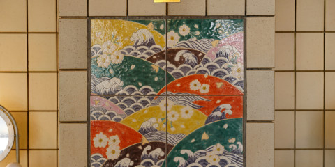 浴場内には、伝統工芸・九谷焼の作家の宮本晄氏作の九谷焼タイルアートが飾られています。