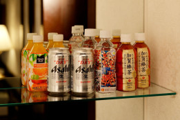 シャンプー・リンス・ボディソープ・石鹸・タオル・バスタオル・ボディタオル・スポンジ・ハミガキセット・くし・ブラシ・シャワーキャップ・ドライヤー・髭剃り・入浴剤・ナイトウェア・バスローブ・スリッパ・綿棒・コットン・衣類の消臭スプレー・冷蔵庫・湯沸しポット・お茶セット(無料)・テレビ・金庫・朝刊無料・衛星放送