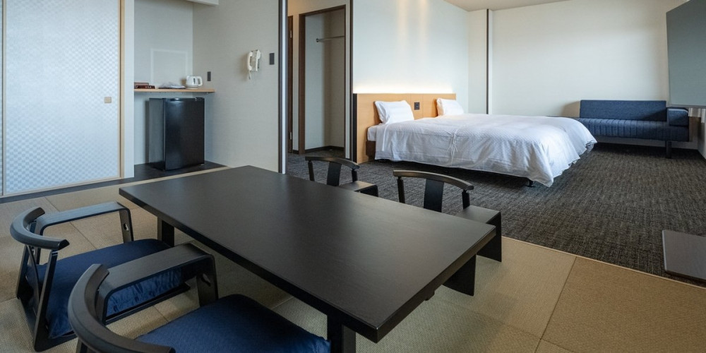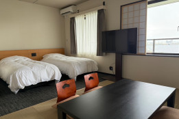 畳のくつろぎとベッドの快適さ、どちらも楽しめる和洋室タイプのお部屋。 ご家族やグループでのご利用にもおすすめ の、使い勝手の良いお部屋です。