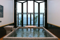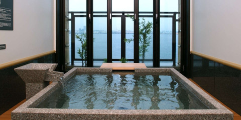 開放的な石風呂は横浜の港の風景を一望できる贅沢な空 間。少し深めの石風呂はじっくり肩まで身体を沈めること ができ、身体の芯まで温まります。