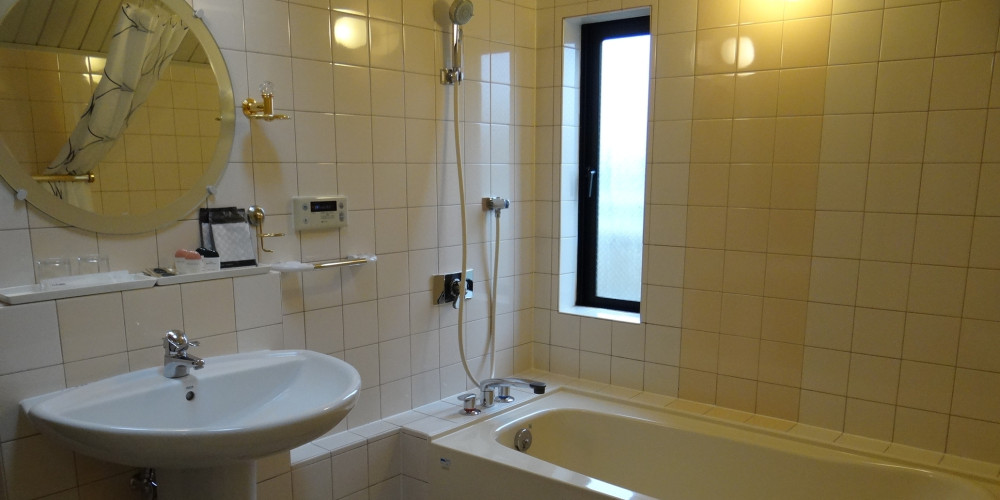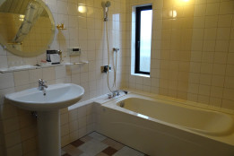 大きなバスタブは足を伸ばせるサイズです