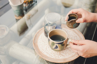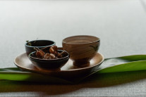 ミネラルを多く含む沖縄の赤土を使用し伝統工芸「やちむん」で創られた専用座器に座り、