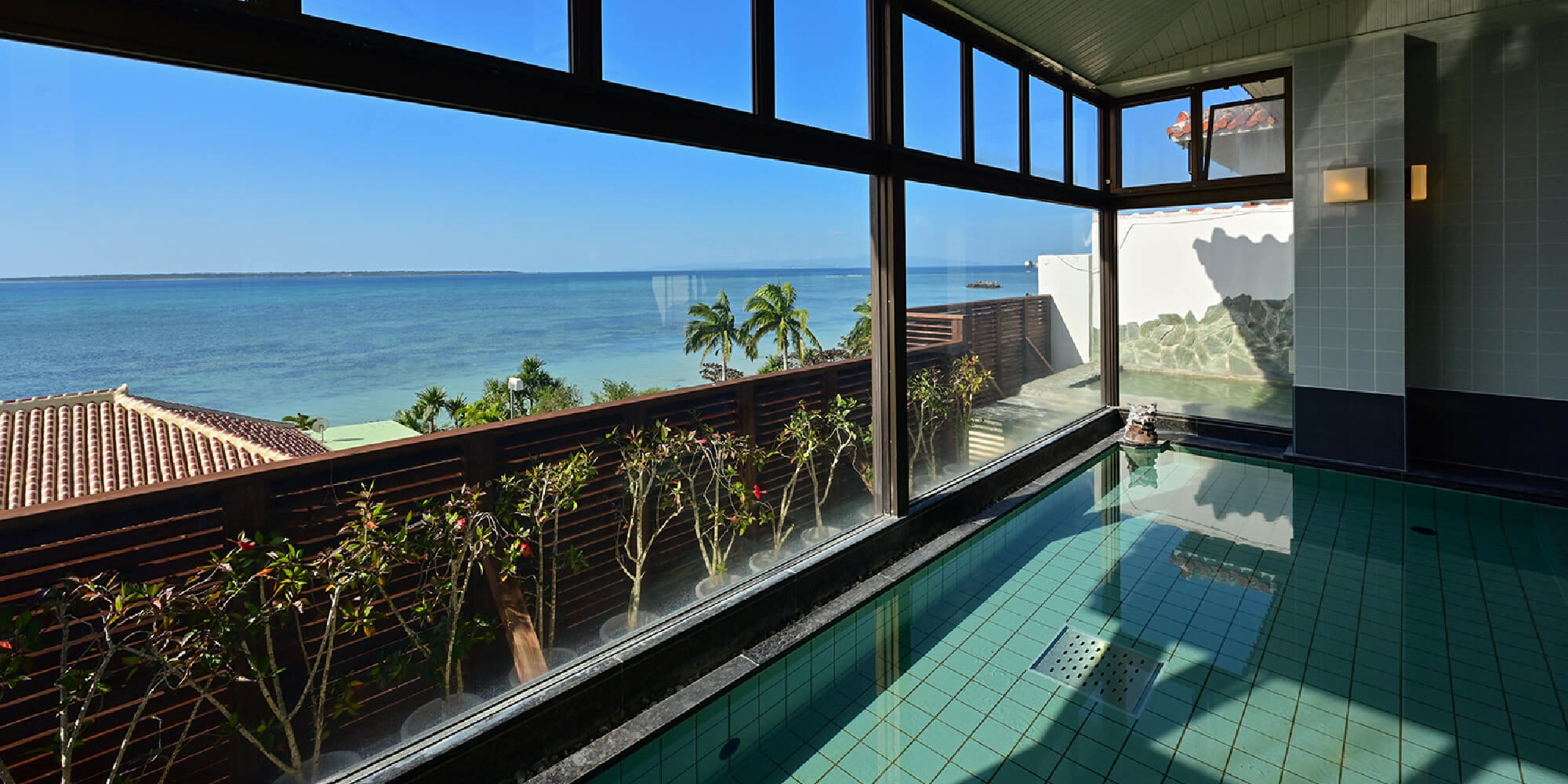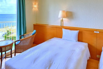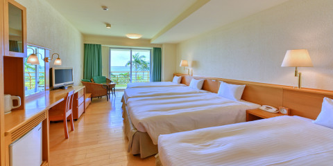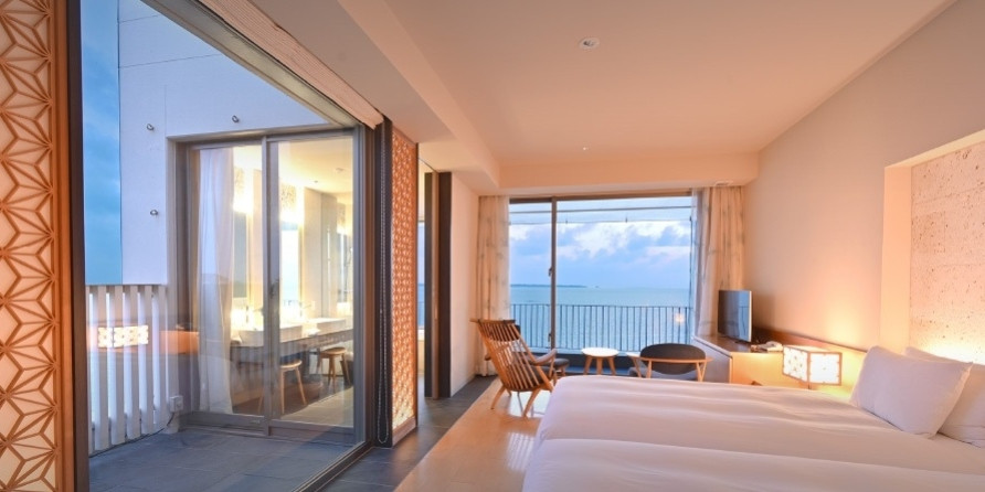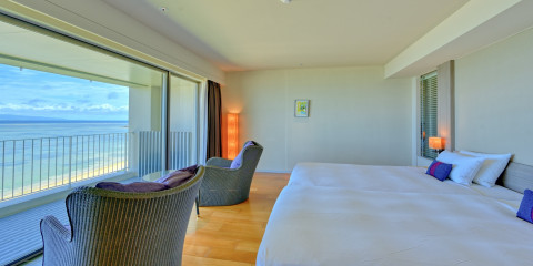 コバルトブルーの海を臨む、広いバルコニー。 部屋から見える景色は空色に映える、沖縄のシンボル・赤瓦屋根と珊瑚礁が作り出す美しい海。 澄み渡る青い空と、ここちよい風がむかえ入れてくれます。 グループ旅、家族旅行におすすめ。