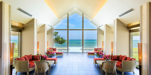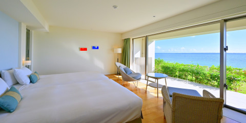 最上階コーナー限定1室のみのスペシャルルーム。客室内専用コート、大きな窓から差し込む暖かな日差しや風がより一層リゾート感を高めます。 3方向オーシャンビューのバスルームからは、珊瑚礁が作り出すあざやかなグラデーションの海を一望。 バスアメイティはjohn masters organics。最高のバスタイムを体験ください。