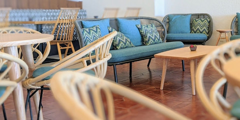 海が見える屋内席「波の詩」にて、ごゆっくりお召し上がりくださいませ。