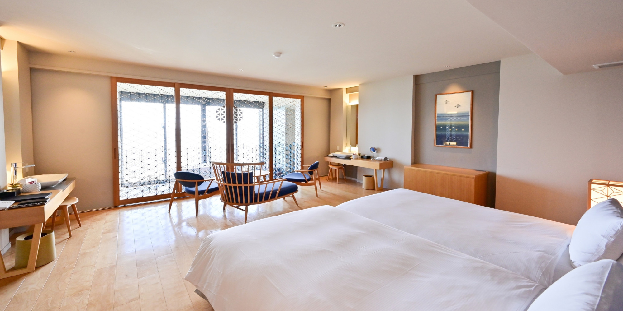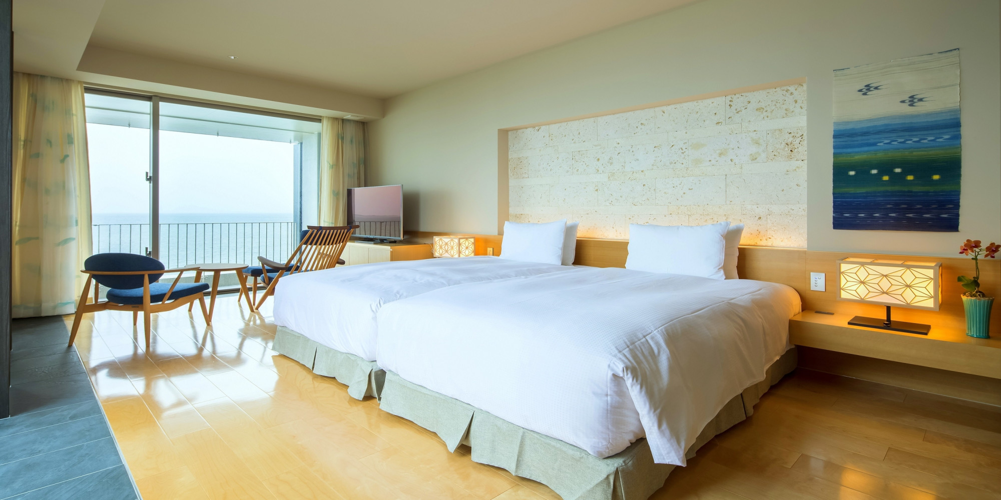 全室オーシャンフロント。1・2階、3・4階カラーコンセプトが変わり、旅のシーンに合わせお選びいただけます。 客室内を全てフローリングにし、気取らずに素足でゆったりとお寛ぎ頂ける贅沢な空間を演出。 朝起きてから夜眠るまで、石垣島の海と空をご堪能いただけます。 バスアメイティはjohn masters organics。最高のバスタイムを体験ください。
