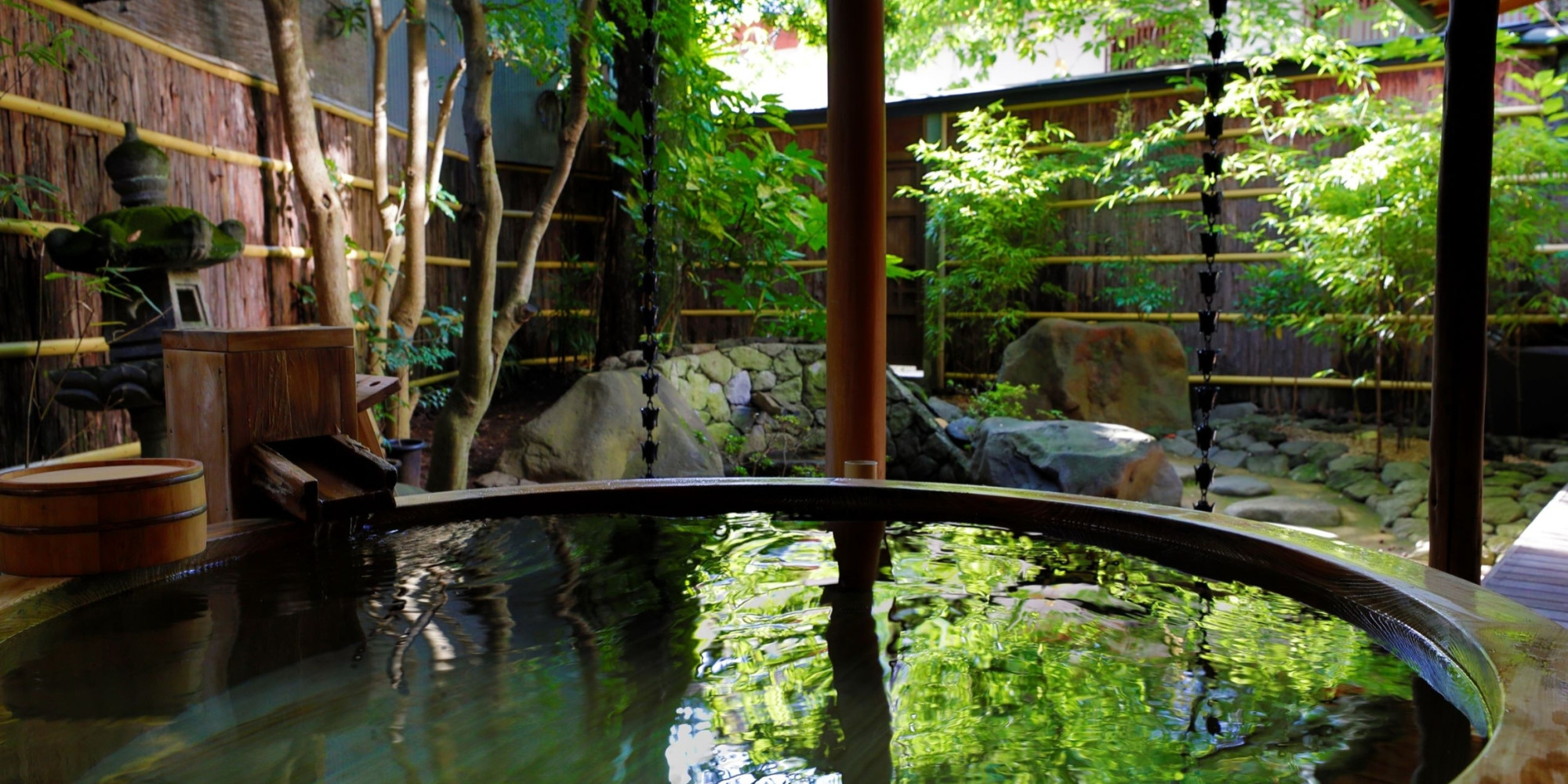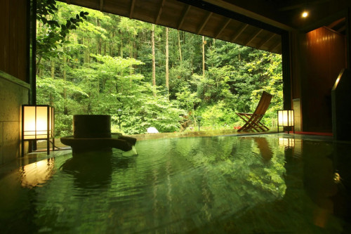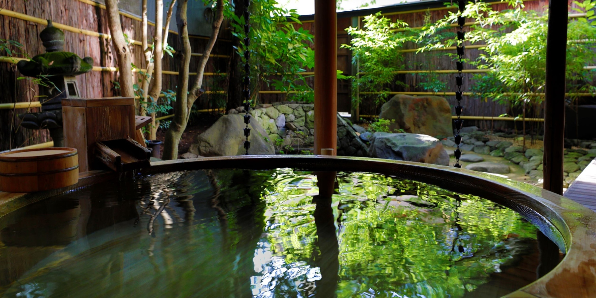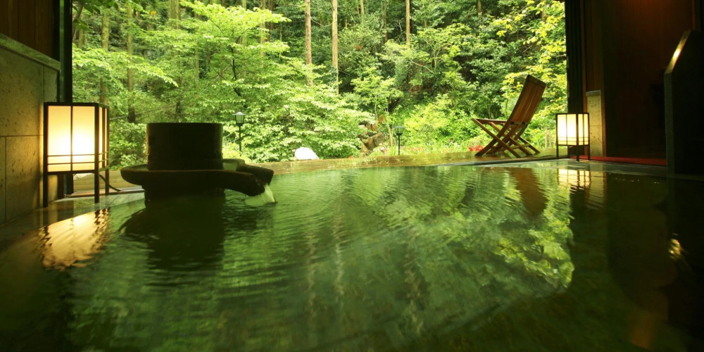 自然林に面した貸切露天風呂「山水」では木々のさざめきに耳を澄まし、