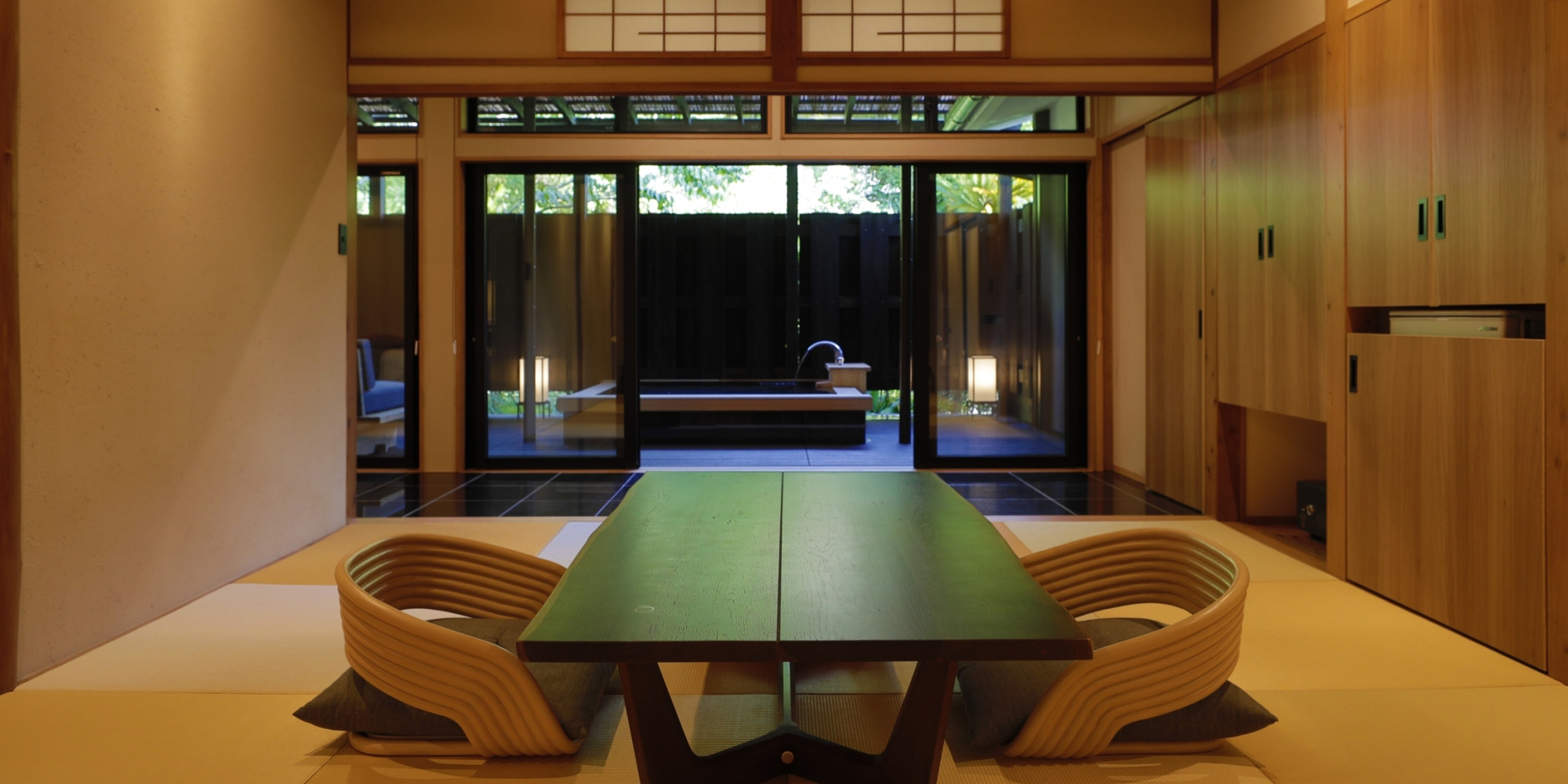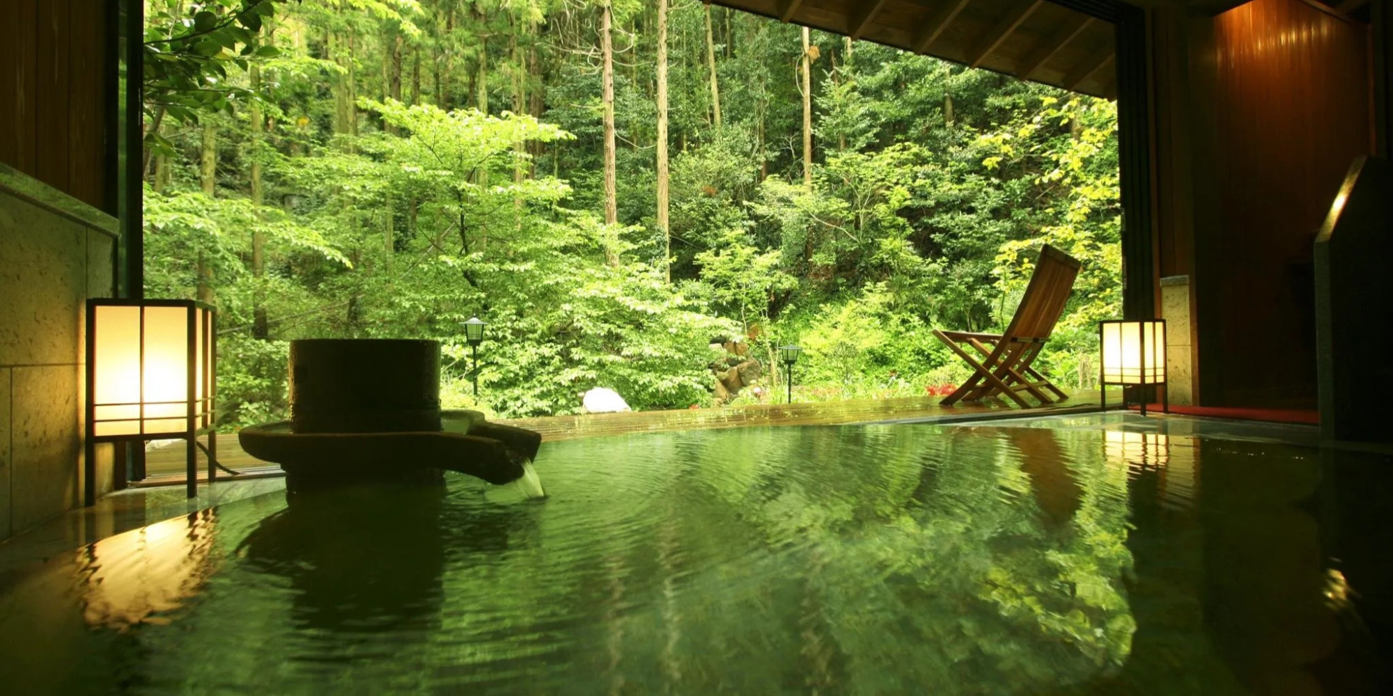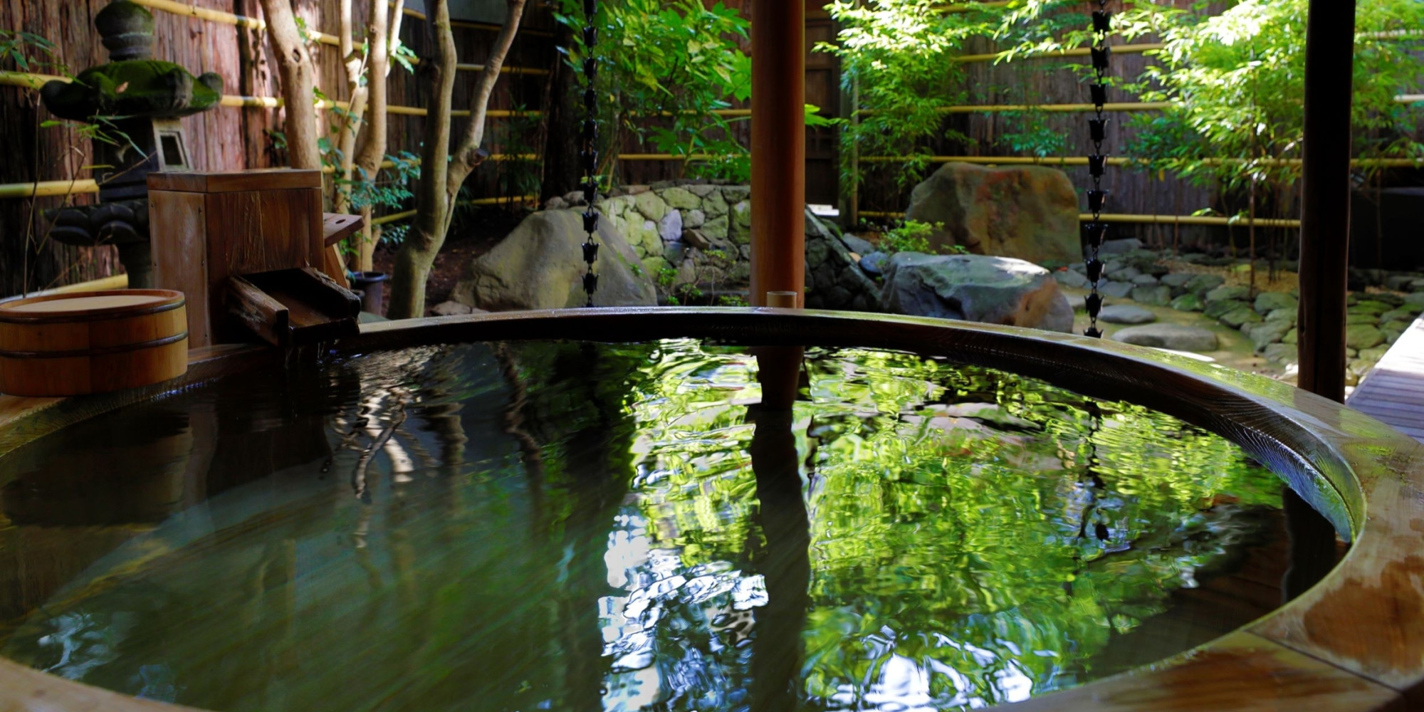 自然林に面した貸切露天風呂「山水」では木々のさざめきに耳を澄まし、