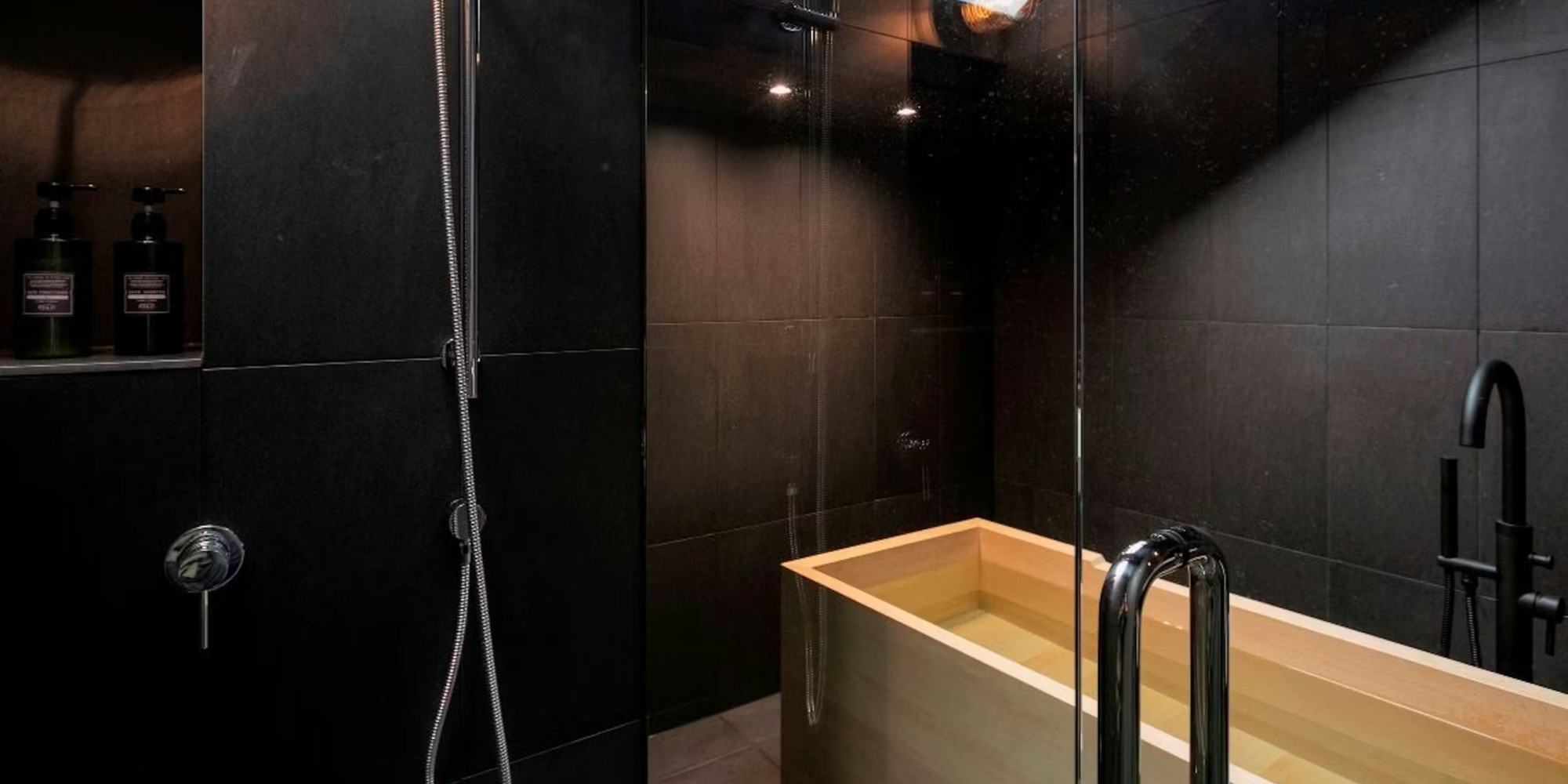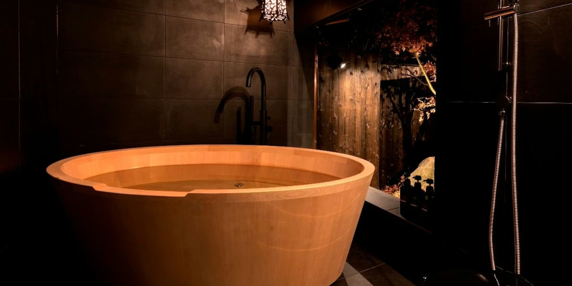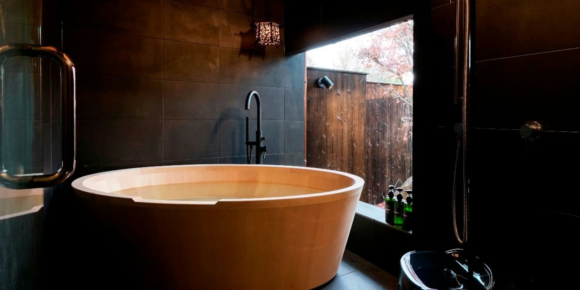 専用の中庭を望む檜風呂(半露天風呂)が備わっています。