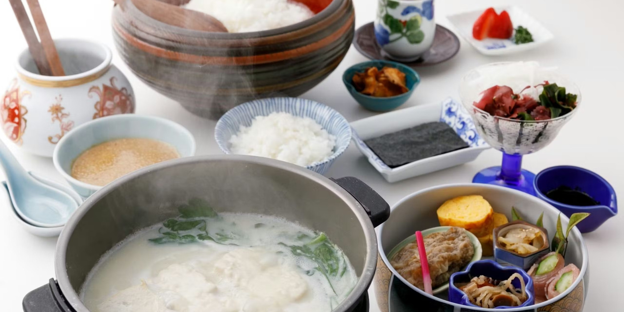 とろとろの温泉湯豆腐をメインとした自慢の朝食はやさしく体に染みわたり、さわやかな朝にぴったりのメニュー。