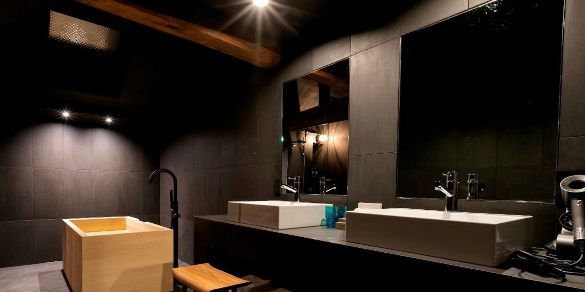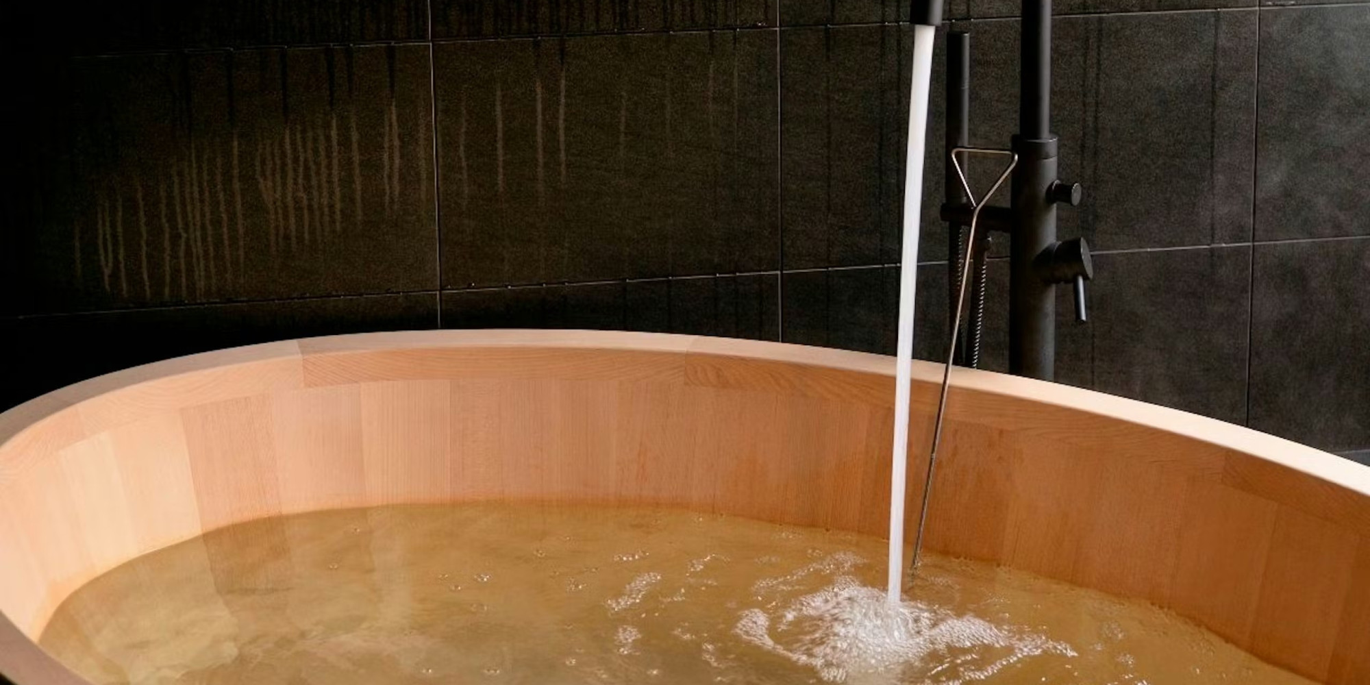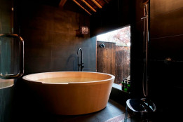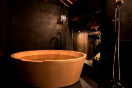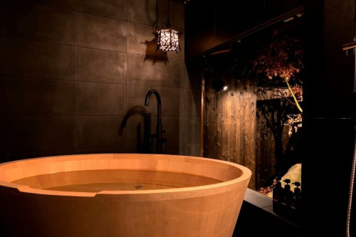木を基調とした浴室には檜風呂が設置されており、心地よい香りと共にリラックスできます。