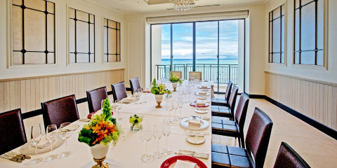 大きな窓から差し込む明るい光と眼前に広がる美しい眺望。白を基調としたエレガントな雰囲気が印象的な宴会場。ウエディングパーティーからビジネスまで幅広い用途でご利用いただけます。