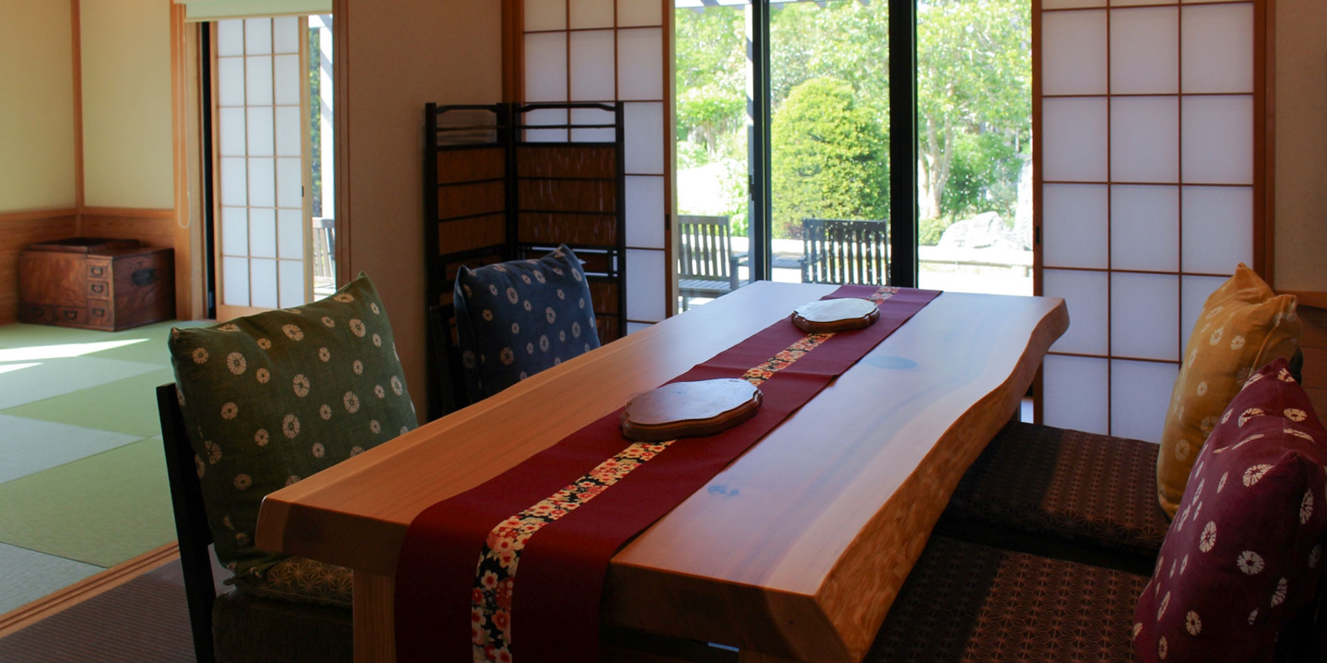 千坪の広大な敷地に建つ三十坪の風情ある日本家屋・別邸。心地よい日が木漏れ日が差し込む静かな森の中で、非日常のひとときをお楽しみいただけます。