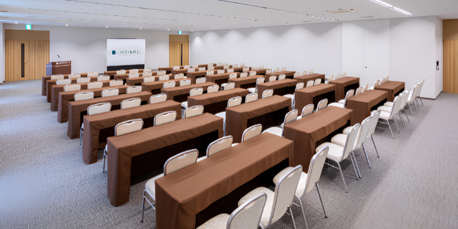 最大128名様(シアター形式)まで収容可能なファンクションルームです。セミナーや会議、修学旅行でのお食事など、さまざまな用途でご利用いただけます。