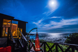 輝く海に流れる雲、海に沈む夕日だけではなく、紅い月が海に沈む月の入りからの満点の星空。