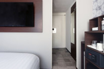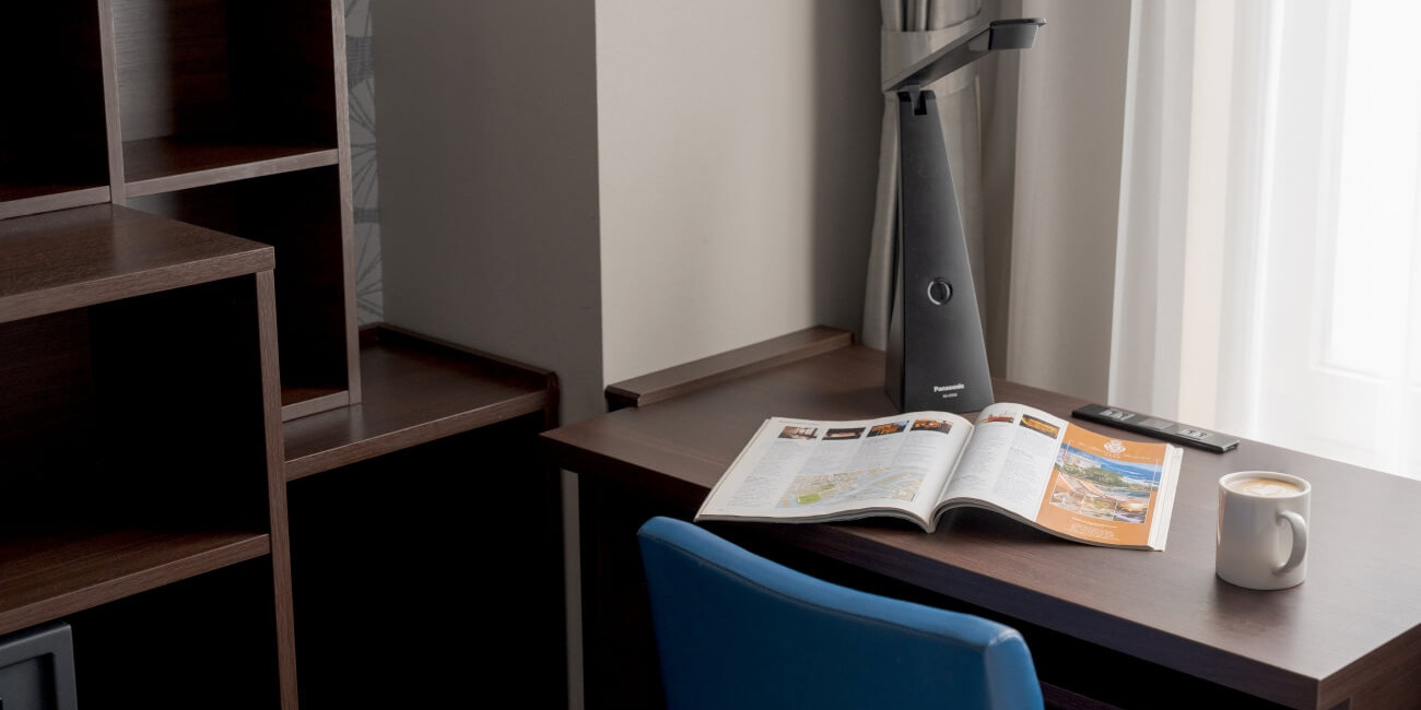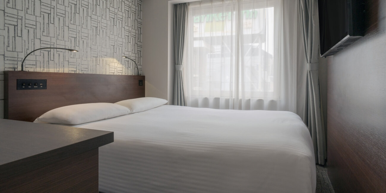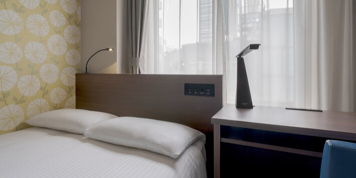 40インチのTVを壁掛けにしているのでデスクを広くお使いいただけるとともに、枕元のUSBコンセントや読書灯、インターネット接続などでビジネスのお客さまをサポートします。