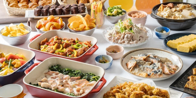 料理長厳選の白米、焼きたてのクロワッサンによく合うお料理や副菜、そしてデザートまで心ゆくまでご堪能ください。