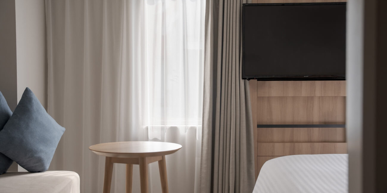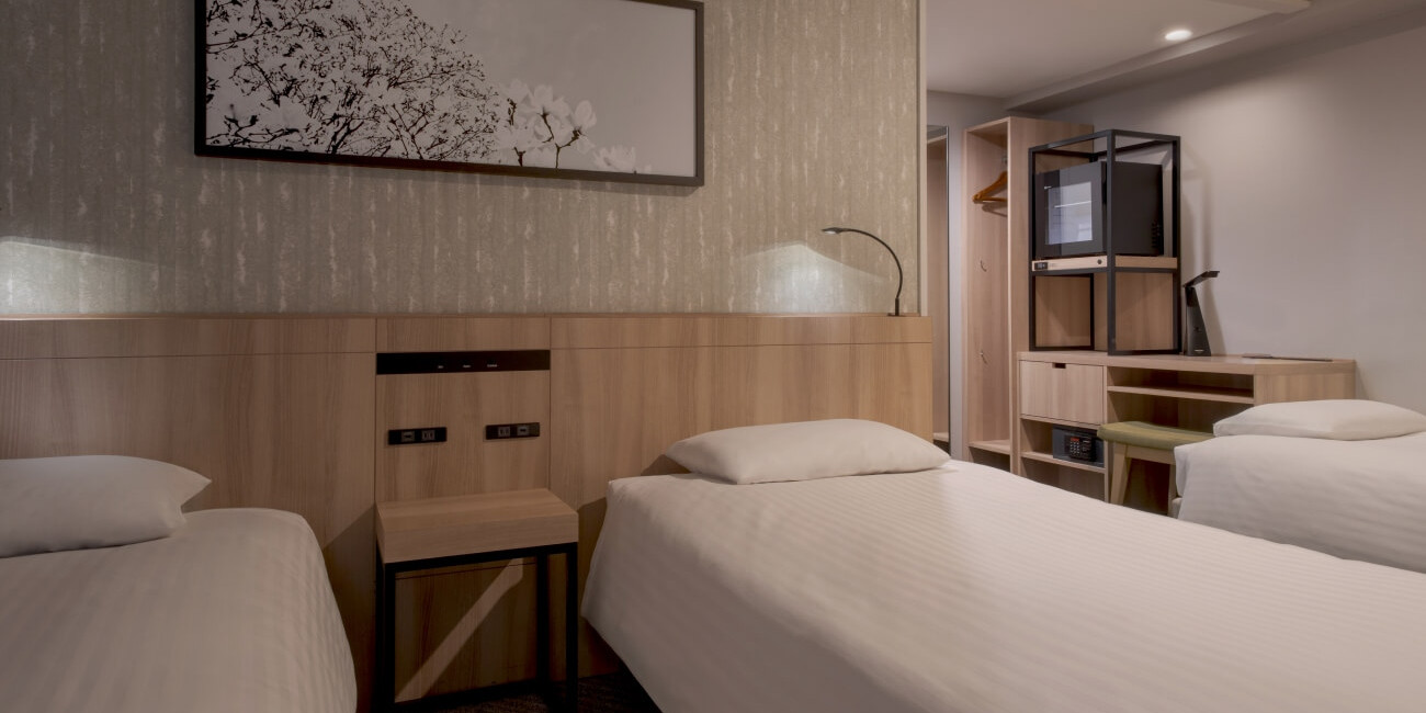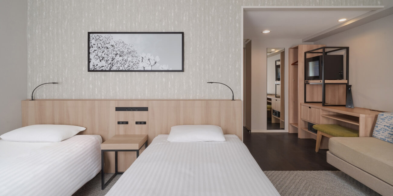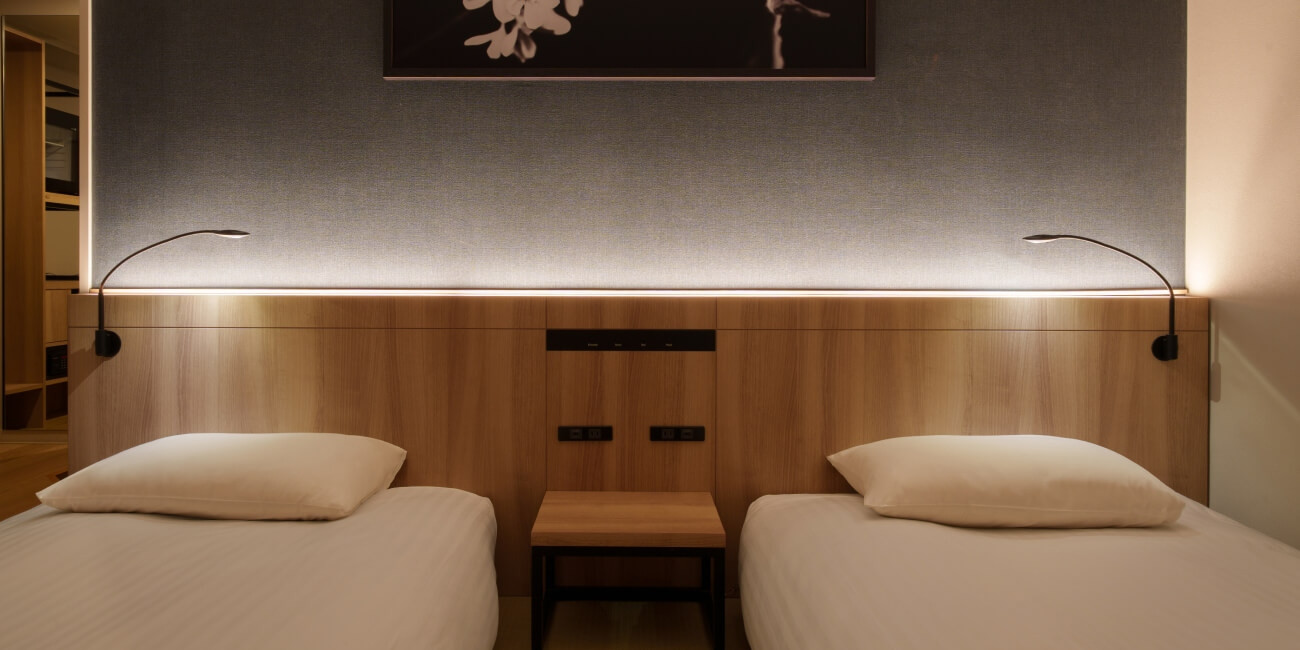 ベッド幅110㎝2台のツインルームは、ベッドに居ながらも壁掛けTVを見ながらゆっくり休めます。